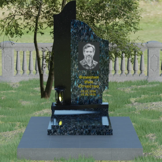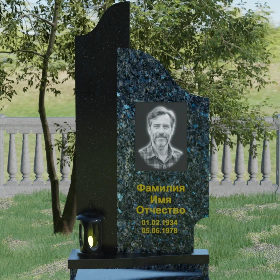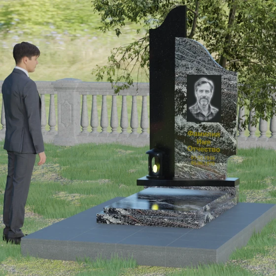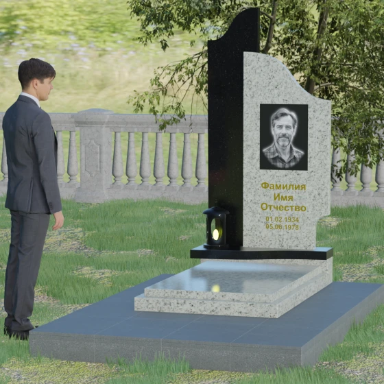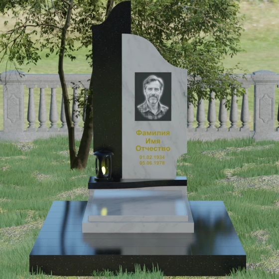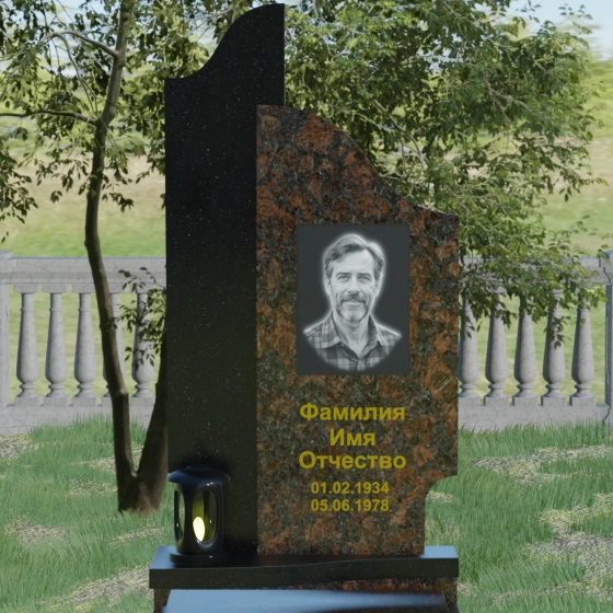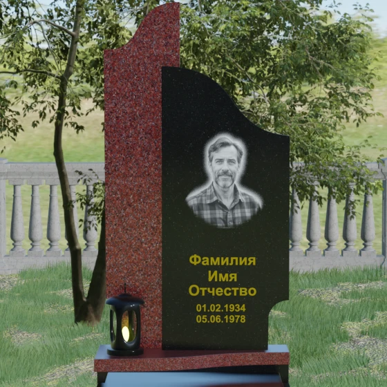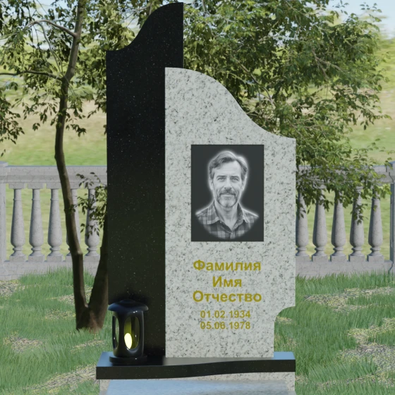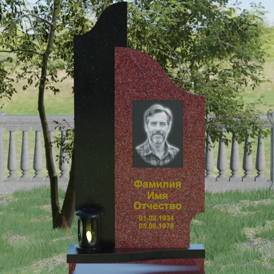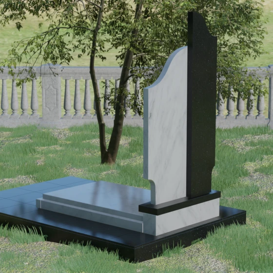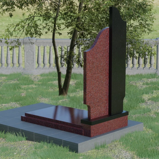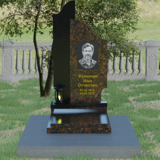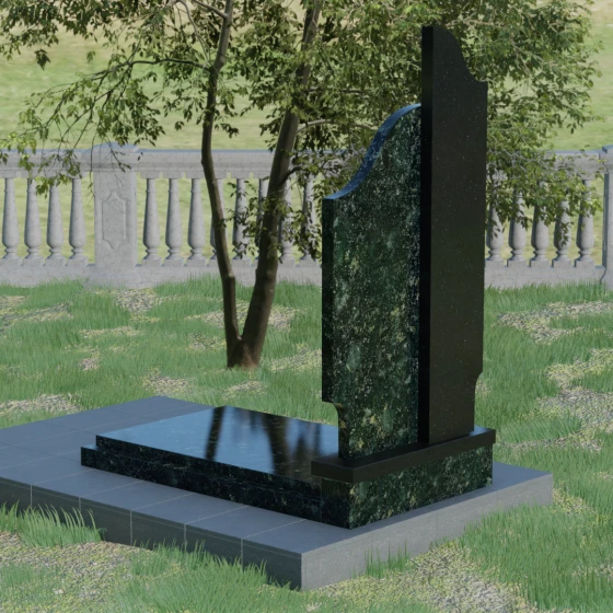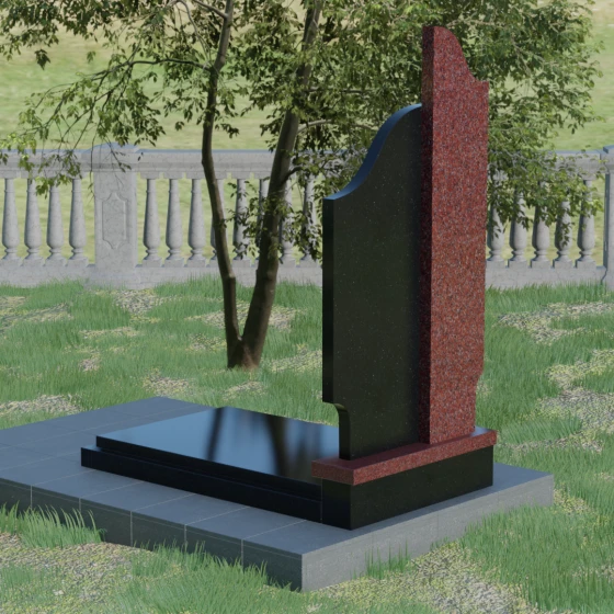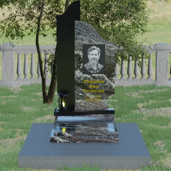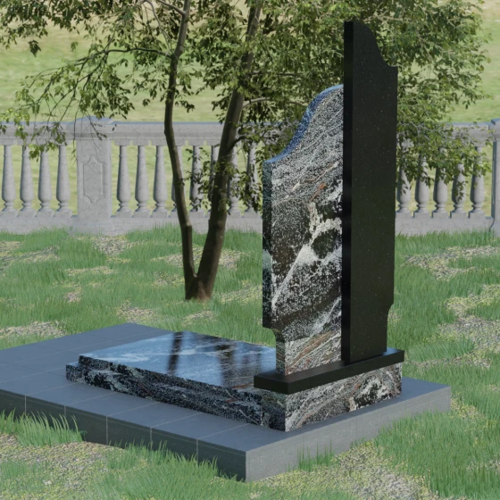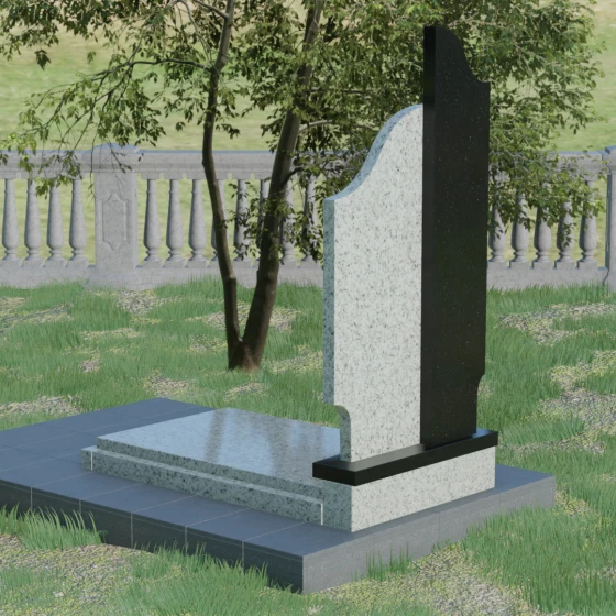 Данная мемориальная композиция представляет собой сложный архитектурный ансамбль, в основе которого лежит игра геометрических форм и контрастных фактур. Основная стела состоит из двух вертикальных элементов разной высоты и конфигурации, что создает динамичный и в то же время уравновешенный силуэт. Левая часть стелы выполнена с мягким, волнообразным изгибом, напоминающим спокойное течение времени или уходящий за горизонт путь. Правая часть — более высокая, узкая и статная, с асимметричным «рваным» навершием, которое символизирует возвышенность духа и незыблемость памяти. Такое сочетание плавности и резкости делает это надгробие из натурального камня универсальным решением, способным передать как нежность утраты, так и твердость характера ушедшего человека.
