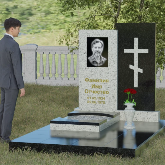 Кому подойдет: Эта модель является универсальным решением для тех, кто ищет баланс между традициями и современным дизайном. В строгом контрастном исполнении (черный и белый гранит) мемориал станет достойным памятником отцу, мужу, брату или дедушке, подчеркивая их мужество и твердость. При выборе более мягких оттенков, таких как мрамор Тассо или гранит Блю Перл, композиция приобретает нежность и светлую грусть, идеально подходя для оформления захоронения матери, жены или дочери. Это выбор людей, стремящихся выразить свою глубокую скорбь через благородную эстетику камня, которая останется неизменной для многих поколений потомков.