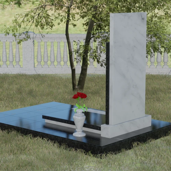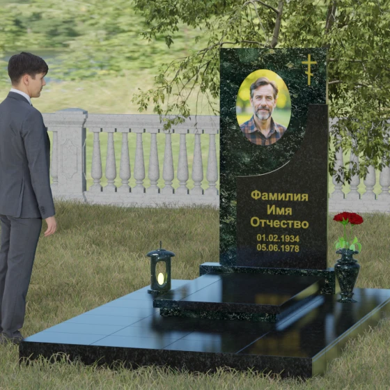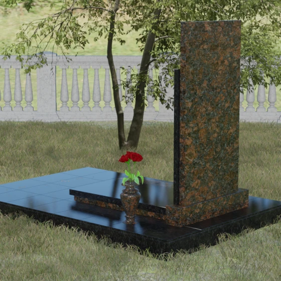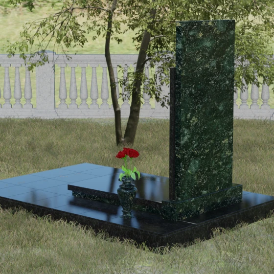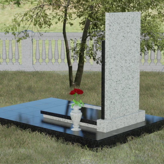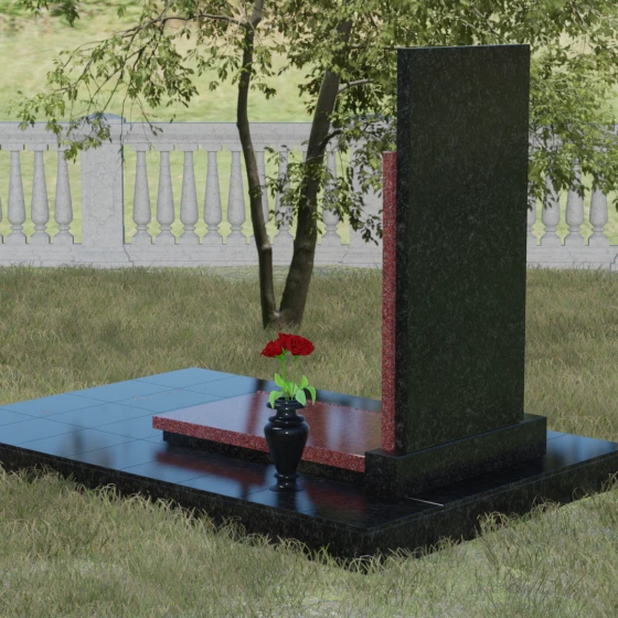 Модель Артикул 024 представляет собой законченное архитектурное решение. Стела установлена на массивный гранитный цоколь, который служит надежным фундаментом и придает всей конструкции необходимую устойчивость. Важной особенностью данного проекта является полное мощение участка: вместо открытого грунта используется сплошная надгробная плита. Это не только создает эстетически безупречный, аккуратный вид, но и значительно упрощает уход за местом захоронения, избавляя от необходимости борьбы с сорняками. В едином стиле с основным монументом выполнены дополнительные элементы декора: изящная каменная ваза, установленная на плите, позволяет приносить живые цветы, сохраняя гармонию композиции. Каменный бордюр по периметру участка четко очерчивает границы мемориала, превращая его в уединенное место для тихой молитвы и воспоминаний.