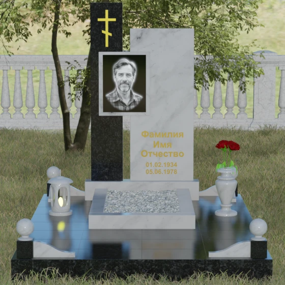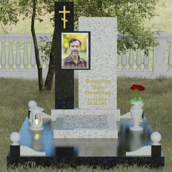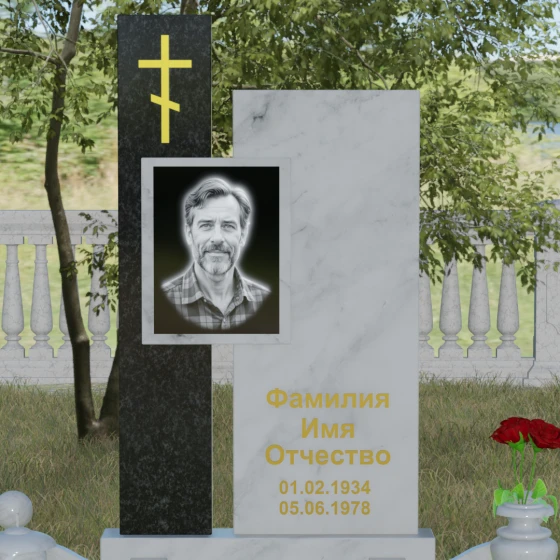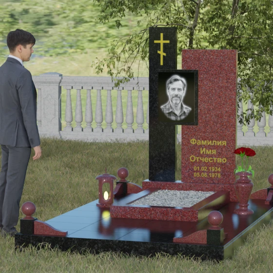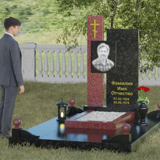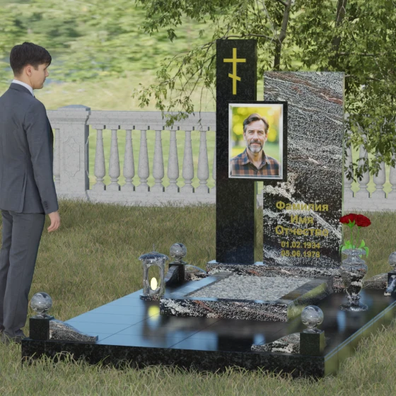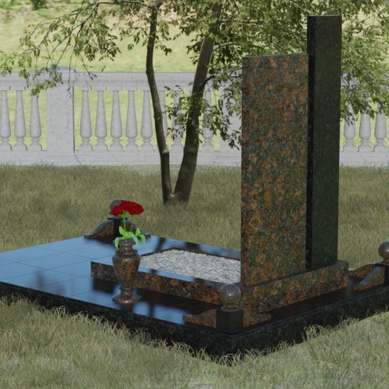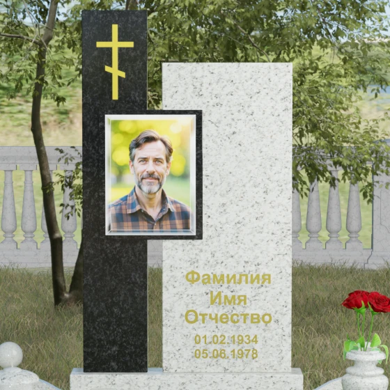 Данное ритуальное изделие представляет собой подлинный образец современного мемориального искусства, в котором строгость архитектурных форм гармонично сочетается с глубоким философским подтекстом. Композиция выстроена на изящном сопоставлении двух вертикальных стел, имеющих разную высоту и фактуру. Асимметричное исполнение символизирует многогранность человеческой жизни: её взлеты и земное завершение. Высокая зеркально-черная стела воплощает собой бесконечность космоса и тишину вечного сна, в то время как примыкающий к ней цветной элемент из благородного камня привносит в ансамбль теплоту земных воспоминаний. Плавные переходы между гранями и безупречная полировка создают ощущение текучести времени, которое застыло в камне, оберегая вечный покой усопшего.