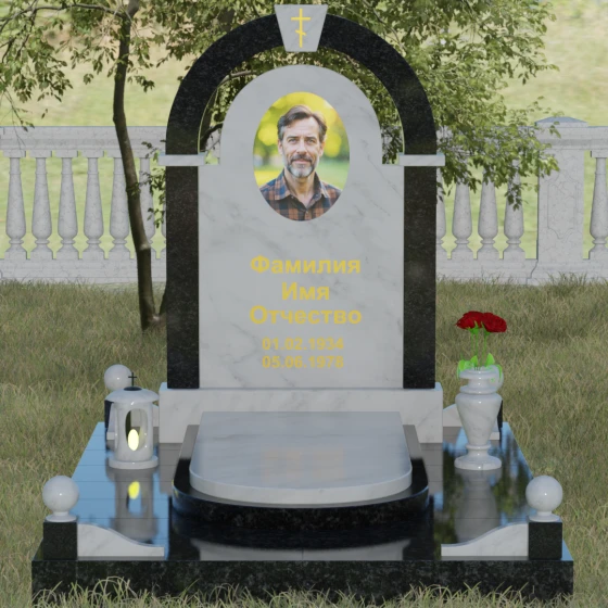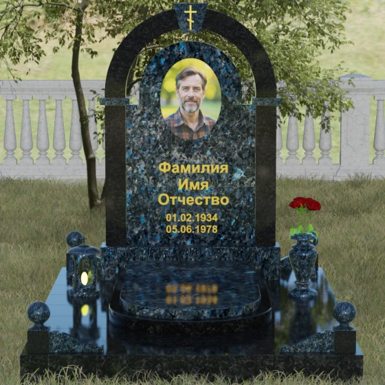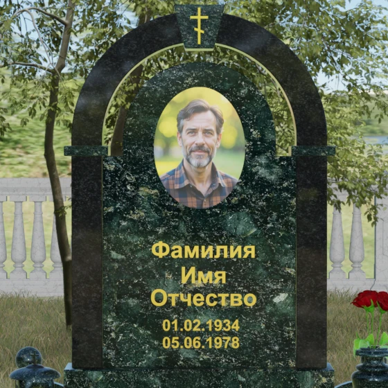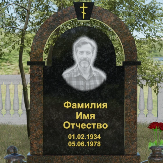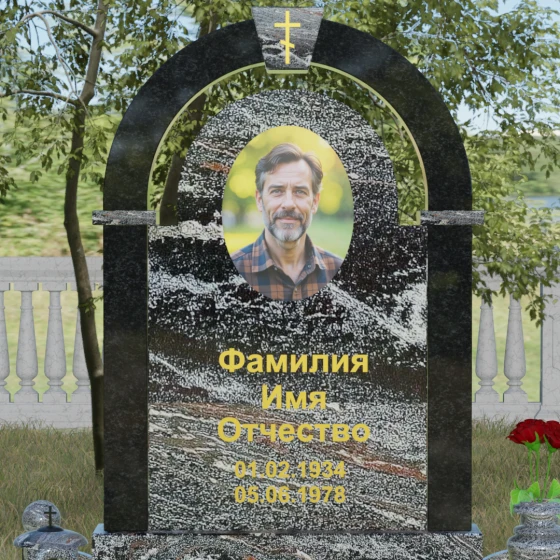 Представленная мемориальная композиция — это триумф архитектурной мысли, воплощенный в благородном камне. В основе дизайна лежит классическая форма арки, которая во многих культурах символизирует небесный свод и торжественный переход в вечность. Центральная стела, имеющая мягкое скругление сверху, обрамлена массивным внешним контуром, создающим эффект глубины и защищенности. Такое многоуровневое решение позволяет играть на визуальных объемах: строгие вертикальные линии боковых колонн уравновешиваются плавным изгибом верхней части, подчеркивая гармонию и покой. Зеркальная полировка лицевых граней доведена до совершенства, в ней отражается мир, напоминая о хрупкой связи между прошлым и настоящим.