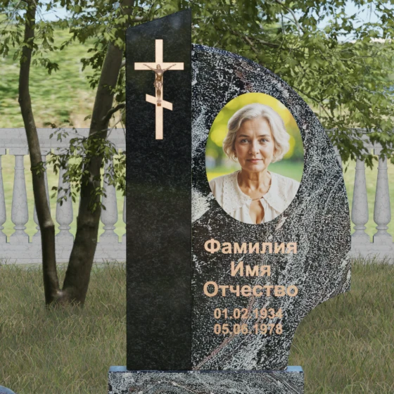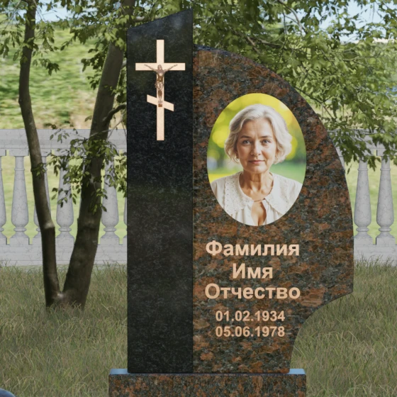 Оформление и советы искусствоведа: Для данной модели идеально подходит гравировка портрета в овальном или круглом формате, размещенная в верхней части «волнообразной» стелы. Это уравновешивает массивность левой части с крестом. Текст (ФИО и даты) рекомендуется выполнять глубоким академическим шрифтом с последующим покрытием сусальным золотом или «под бронзу», чтобы поддержать цветовую гамму распятия. Зеркальная полировка камня обеспечит четкость гравировки, которая не потускнеет и через сто лет, требуя лишь минимального ухода — протирки мягкой ветошью.