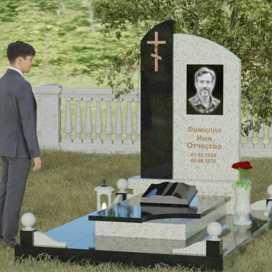 Данное ритуальное изделие представляет собой выразительную художественную композицию, построенную на гармонии двух различных фактур и форм. Выбор этой модели обусловлен её глубоким символизмом: асимметричное разделение стелы на две части олицетворяет земной и небесный пути. Левая часть, выполненная в виде строгого вертикального столпа из насыщенного цветного гранита, служит основанием для объемного православного креста с детально проработанным распятием. Правая же часть, имеющая мягкий, плавный изгиб верхней грани в форме волны, создает идеальное пространство для размещения портрета и памятных слов. Сочетание строгой геометрии и лиричного изгиба позволяет выразить всю многогранность чувств — от глубокой скорби до светлой памяти.