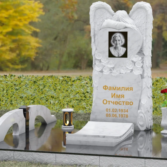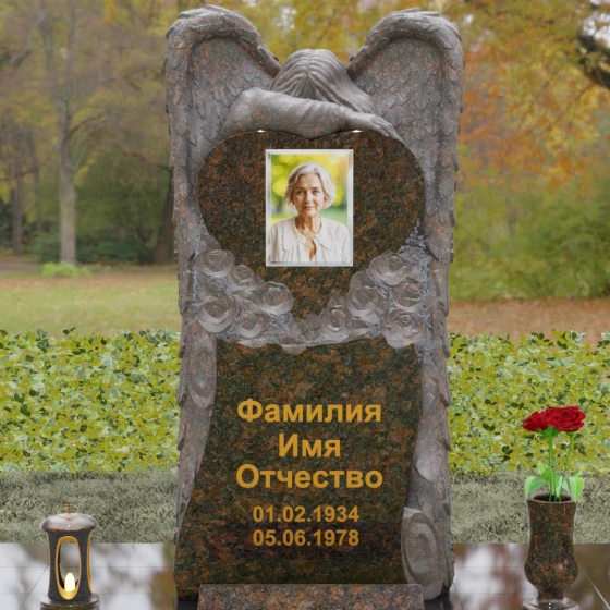 Данная мемориальная композиция представляет собой истинное произведение ритуального искусства, где каждый элемент пропитан глубоким символизмом и благородством. Центральным художественным образом выступает величественная фигура скорбящего ангела, чьи массивные крылья бережно, словно в последней попытке защитить, обрамляют стелу в форме сердца. Мастерство камнереза здесь проявляется в искусной игре контрастов: матовая, детально проработанная фактура оперения крыльев и драпировок одежды небесного покровителя противопоставлена зеркально отполированной глади черного гранита. Именно на этой поверхности, лишенной малейших изъянов, свет преломляется наиболее эффектно, создавая ощущение глубины и монументальности.