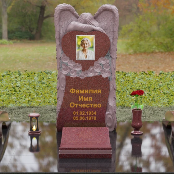 Особое внимание уделено флористическим мотивам. В основании «сердца» вырезаны объемные бутоны роз. Их лепестки, выполненные в технике глубокого барельефа, кажутся живыми и нежными, несмотря на твердость материала. Эти цветы не просто украшают изваяние, они олицетворяют вечную любовь, которая не увядает со временем. Плавные, текучие линии стелы гармонично сочетаются с архитектурной строгостью основания, создавая завершенный и эстетически безупречный ансамбль.