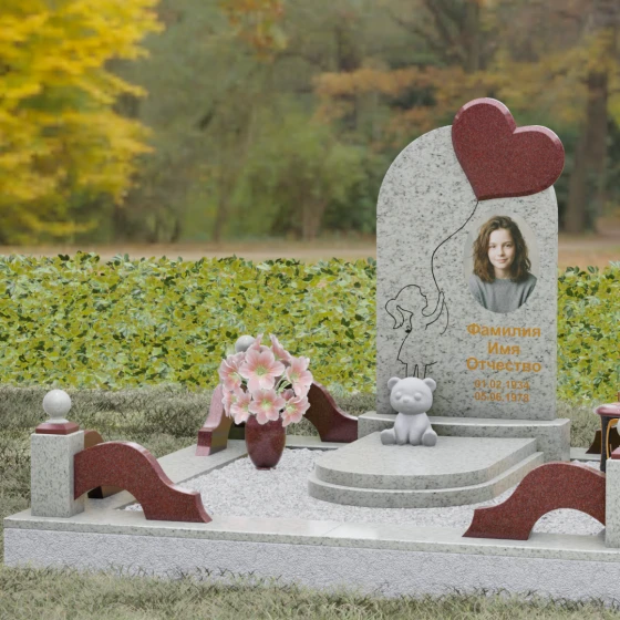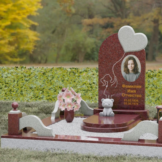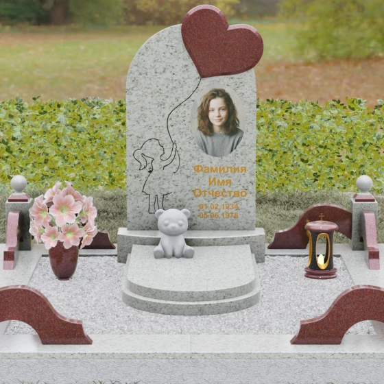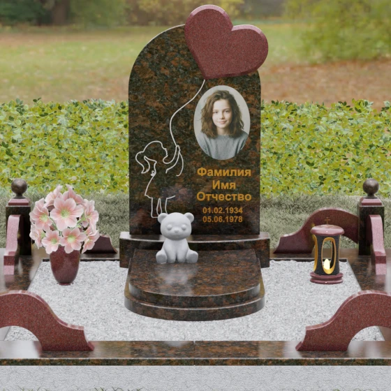Представленная мемориальная композиция — это не просто надгробие, а глубокое художественное высказывание, в котором застыло мгновение нежности и вечной связи. Основная стела выполнена в форме изящной асимметричной арки из глубокого черного гранита. Главным акцентом ансамбля выступает объемное сердце из насыщенного красного камня, которое словно парит в воздухе, подобно легкому воздушному шару. Тонкая, едва уловимая линия резьбы соединяет этот символ любви с рукой выгравированного силуэта маленькой девочки. Мастерски исполненная гравировка ребенка с хвостиком, тянущегося вверх, придает всей конструкции невероятную легкость и трогательность. Игра контрастов здесь возведена в абсолют: зеркальная полировка черного обелиска соседствует с ярким цветом сердца, создавая эффект трехмерного пространства и визуального объема.