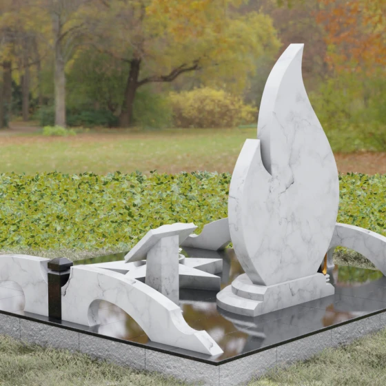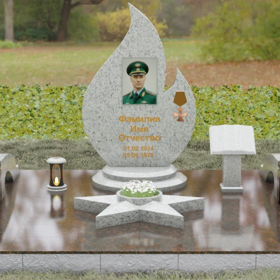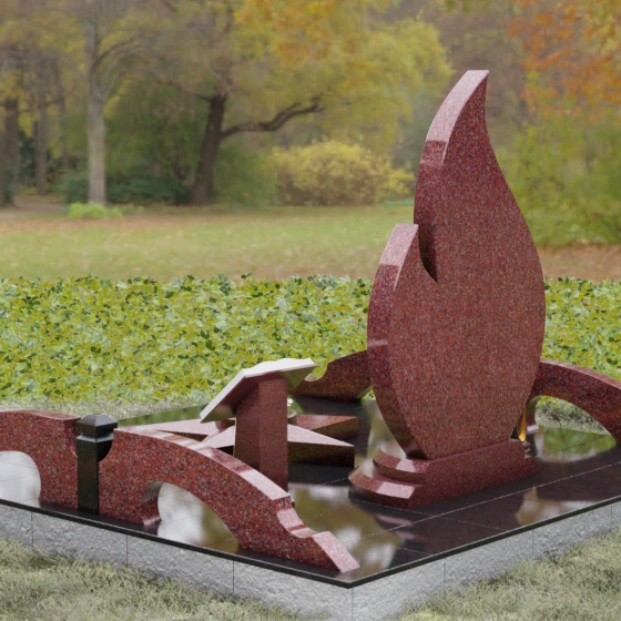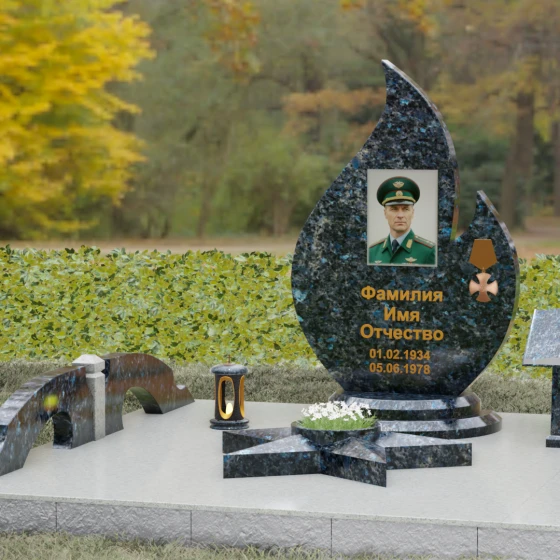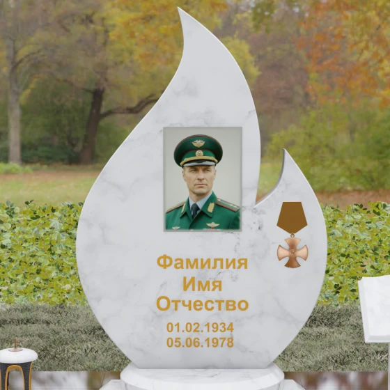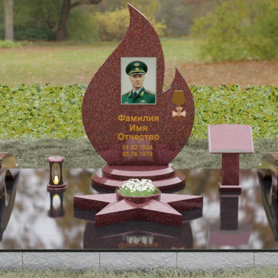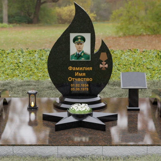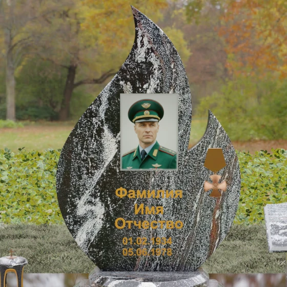 Центральное мемориальное изделие выполнено в уникальной форме застывшего пламени, которое стремится ввысь, символизируя неугасаемую энергию жизни. Плавные, текучие изгибы боковых граней переходят в изящное заостренное навершие, создавая динамичный и одновременно строгий силуэт. Особое внимание стоит уделить обработке камня: по всему периметру лицевой грани снята широкая фаска, которая благодаря безупречной зеркальной полировке создает великолепную игру света и тени, подчеркивая объем и скульптурность формы.
