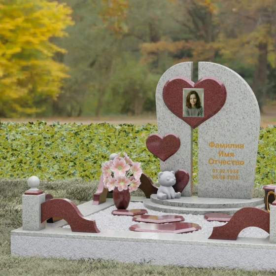 Каждая линия этой модели наполнена глубоким смыслом. Разделенная на две части стела символизирует границу между двумя мирами, а объединяющее их сердце — торжество любви над временем и забвением. Фигура медвежонка у подножия — символ чистоты, беззащитности и невинной души, что часто выбирают для оформления захоронений самых дорогих и рано ушедших близких. Использование контрастных цветов камня подчеркивает многогранность человеческой жизни, где есть место и глубокой скорби, и светлым воспоминаниям. Этот памятник не просто обозначает место покоя, он рассказывает историю глубокой привязанности, которая не исчезает с годами.