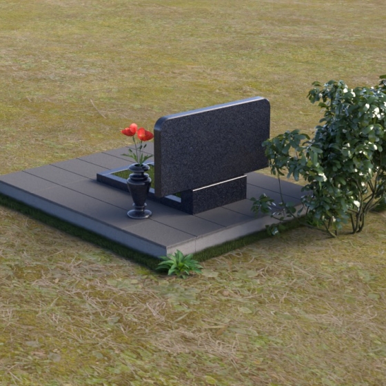 Особое внимание привлекает игра света и тени на полированных гранях. Лучи солнца, скользя по поверхности, создают эффект объема, подчеркивая глубину и фактуру камня. Стела водружена на основание, состоящее из двух элементов: горизонтальной плиты, выполненной в той же зеркальной полировке, что и стела, и более широкой подставки серого цвета с матовой фактурой, разделенной на прямоугольные сегменты. Такое решение создает ощущение надежности и основательности, подчеркивая вечность памяти. Рядом со стелой располагается ваза из черного гранита, выполненная в классическом стиле, предназначенная для живых цветов – символа жизни и продолжения памяти.