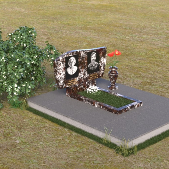 Этот памятник являет собой образец мастерства в обработке камня. Особое внимание привлекает игра контрастов: зеркально отполированный гранит, отражающий небо и окружающий мир, и деликатно выгравированные портреты усопших. Лаконичная ваза, выполненная в том же стиле, что и стела, гармонично дополняет композицию и служит местом для живых цветов, символизирующих вечную память и любовь.