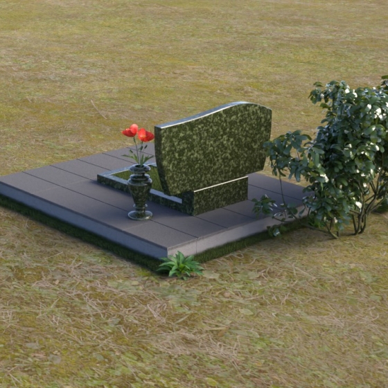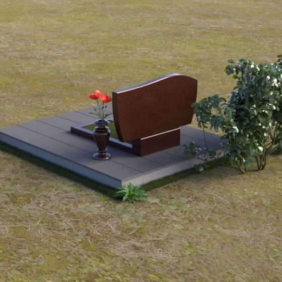 Форма стелы отличается лаконичностью, но при этом не лишена изысканности. Верхняя часть имеет мягкий, волнообразный изгиб, словно склоняясь в знак уважения и скорби. Прямоугольная подставка под стелой, выполненная в том же полированном граните, добавляет композиции завершенность и устойчивость. Дополнительная горизонтальная плита, расположенная на основании, создает пространство для возложения цветов и памятных вещей, позволяя выразить свою любовь и уважение.