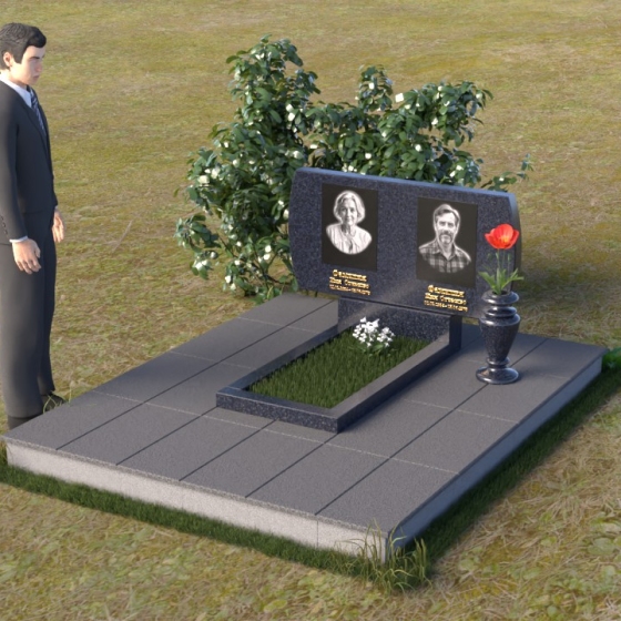 Композиция памятника строится на контрасте строгих геометрических форм и плавных линий, создавая гармоничный и запоминающийся образ. В верхней части возвышается стела из черного гранита, чья зеркальная полировка отражает небо и окружающий мир, словно напоминая о связи земного и небесного. Верхние углы стелы скруглены, смягчая строгость формы и придавая ей более мягкий, человечный облик. На стеле размещены портреты усопших, выполненные с высокой точностью и передающие их индивидуальность. Золотистые надписи имен и дат словно светятся на фоне черного камня, добавляя торжественности и значимости. У подножия стелы располагается горизонтальная плита, также выполненная из полированного черного гранита, создающая ощущение завершенности и устойчивости. Рядом – изящная ваза из того же материала, предназначенная для живых цветов, символа неувядающей памяти и любви.