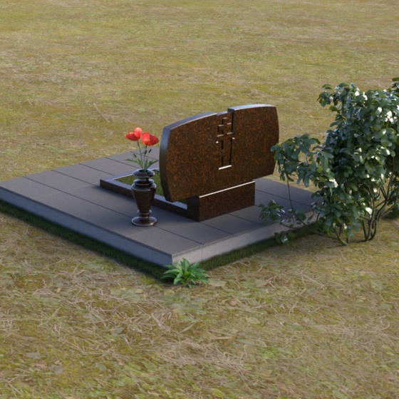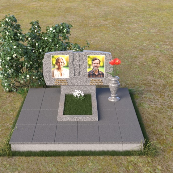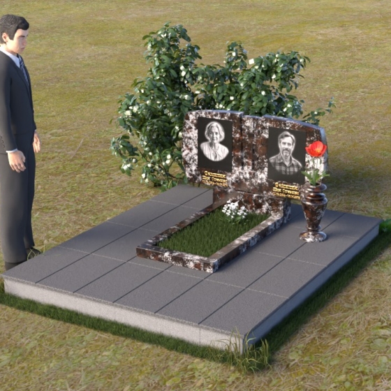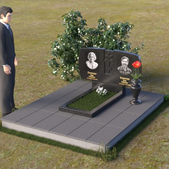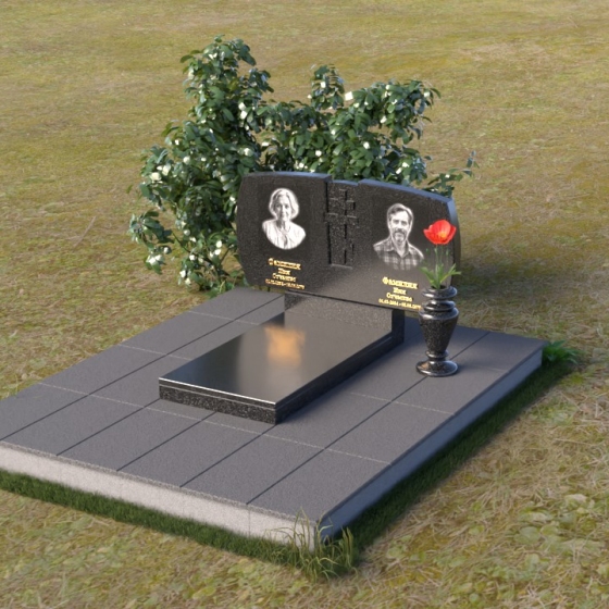 Геометрия модели тщательно продумана. Верхняя часть стел имеет скругленные углы, смягчающие строгость линий и придающие композиции более человечный облик. Между портретами выгравирован лаконичный православный крест, напоминающий о духовности и вере. Основание стел переходит в горизонтальную плиту, образуя единую плоскость с надгробной плитой. Надгробная плита выполнена в виде прямоугольника с полированной поверхностью, отражающей небо и окружающий мир. У основания композиции располагается аккуратная ваза из черного гранита, предназначенная для живых цветов, как символ непреходящей любви и уважения.