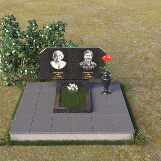 Форма стелы этого памятника предоставляет широкие возможности для оформления. Помимо портретов, на ней можно разместить эпитафии, религиозные символы или другие памятные надписи. Расположение портретов может быть как горизонтальным, как показано на изображении, так и вертикальным, в зависимости от ваших пожеланий. Важно помнить о гармоничном соотношении размеров портретов и остального текста, чтобы создать сбалансированную композицию. Гранитная подставка обеспечивает устойчивость всей конструкции и может быть дополнена цветником или другими элементами благоустройства. Черный цвет камня идеально сочетается с любыми оттенками цветов, поэтому вы можете смело экспериментировать с оформлением, создавая уникальный и запоминающийся образ. Ваза, входящая в комплект, предназначена для размещения живых или искусственных цветов. Она выполнена в строгом стиле и гармонично дополняет общую композицию памятника.