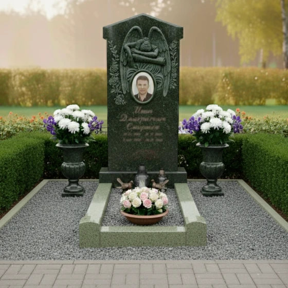 Геометрия модели продумана до мелочей, начиная с верхней части и заканчивая основанием. Плавные изгибы крыльев переходят в ровные, но не резкие грани стелы, что символизирует спокойствие и нерушимость памяти. Массивная опорная тумба обеспечивает надежную устойчивость всей конструкции, а ее полированные поверхности вторят зеркальному блеску стелы, создавая единый, завершенный образ. Благоустройство участка выполнено с исключительным вниманием к деталям. Мемориал установлен на прочный, невысокий гранитный цоколь, формирующий четкие границы участка. Внутреннее пространство цоколя заполнено декоративной каменной крошкой, которая не только придает композиции ухоженный вид, но и значительно упрощает уход за местом захоронения, избавляя от необходимости прополки. По углам участка, за пределами цоколя, размещены две элегантные каменные вазы на высоких постаментах, предназначенные для живых цветов, которые привнесут нотку свежести и жизни в мемориальную композицию. Эти вазы выполнены из того же камня, что и весь комплекс, что подчеркивает единство стиля и продуманность дизайна. Перед стелой, на надгробной плите, предусмотрено место для лампады и небольшой чаши с цветами, создавая уютный уголок для размышлений и воспоминаний.
