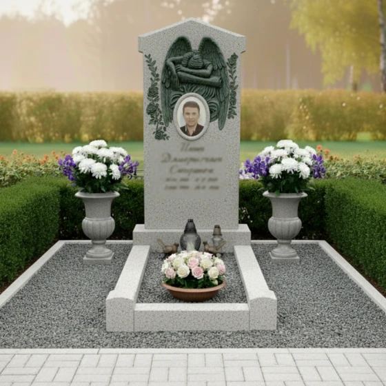 Эта мемориальная композиция отличается гармоничным сочетанием строгих линий и нежных, плавных изгибов, создающих ощущение умиротворения и вечного покоя. Центральным элементом является высокая, величественная стела, выполненная в форме прямоугольника с изящно скругленными верхними углами, что придает ей мягкость и утонченность. Верхняя часть стелы украшена объемным барельефом в виде распростертых крыльев ангела, бережно обнимающих пространство над портретом усопшего. Каждое перо крыльев тщательно проработано, создавая игру света и тени на матовой, бархатистой поверхности камня, в то время как основное поле стелы имеет глубокую, зеркальную полировку, отражающую небо и окружающий мир. В центре композиции, под крыльями, расположено овальное обрамление для фотографии, словно окошко в светлое прошлое, а под ним — гравировка имени и дат, выполненная с особой аккуратностью и почтением.