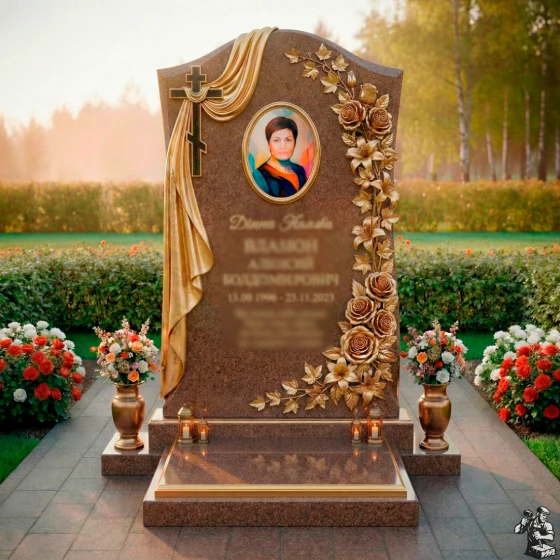 Центральное место на стеле занимает элегантный овальный медальон для портрета, обрамленный тонкими, но выразительными золотыми линиями, которые придают ему особую торжественность. Слева от портрета ниспадает объемная драпировка из камня, искусно имитирующая мягкие складки ткани, что символизирует покой и вечный сон. В верхней части драпировки расположен лаконичный православный крест, выполненный в строгом, но выразительном стиле, подчеркивающий духовное значение мемориала. Правая сторона стелы украшена пышной резной композицией из роз и вьющихся листьев, выполненных с невероятной детализацией. Каждая роза, каждый лепесток вырезан с филигранной точностью, создавая ощущение живого букета. Контраст между черной полированной поверхностью камня и светлыми, матовыми срезами резных элементов придает композиции объем и выразительность, подчеркивая красоту и хрупкость цветов. Эта модель доступна в 8 различных цветовых решениях, что позволяет подобрать камень, который наилучшим образом отразит индивидуальность и характер усопшего. Среди них: глубокий и насыщенный гранит амфиболит, благородный Балтик грин, уникальный Блю Перл, классический Габбро-диабаз, теплый Дымовский, величественный Лезниковский, светлый Мансуровский и изысканный мрамор Тассо. Каждый из этих материалов обладает своей неповторимой фактурой и оттенком, что позволяет создать по-настоящему уникальный и персонализированный мемориал, достойный светлой памяти. Выбор камня становится важным шагом в создании образа, который будет гармонировать с воспоминаниями о человеке, сохраняя его уникальность на века.