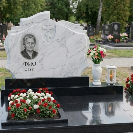 В основе композиции лежит монументальное надгробие, чья форма вызывает ассоциации с раскрытой книгой или древним свитком, символизируя жизненный путь, записанный в вечности. Плавные, волнообразные изгибы верхней части мемориальной плиты, напоминающие страницы, перелистываемые ветром времени, придают конструкции особую элегантность и динамику. В центре верхней части, на фоне глубокой черной полировки, вырезан лаконичный православный крест, выполненный в строгих, классических линиях, без излишних деталей, что подчеркивает его духовную значимость и чистоту веры. Крест, слегка утопленный в камень, создает игру света и тени, делая его объемным и выразительным. Ниже, в левой части надгробия, расположено искусно выполненное портретное изображение, обрамленное в овальную рамку, которая гармонично вписывается в общий контур. Под портретом предусмотрено место для имени и дат жизни, выгравированных четким и торжественным шрифтом, что завершает центральную часть композиции.