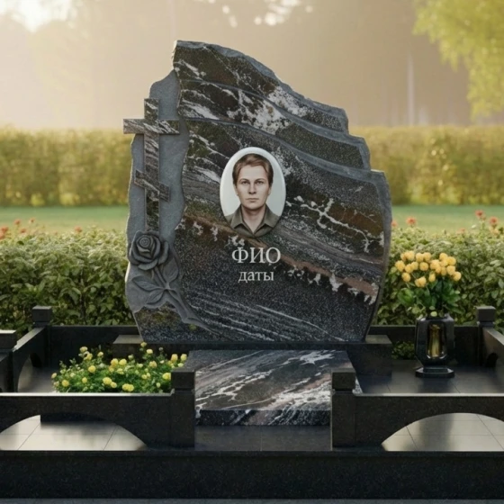 Оформление: Учитывая асимметричную форму стелы, портрет рекомендуется размещать по центральной оси или с небольшим смещением вправо, чтобы уравновесить резную розу и крест. Для ФИО и дат идеально подойдет академический шрифт с глубокой гравировкой и покрытием «под золото» или «под серебро», что добавит монументу аристократизма и читаемости на темном фоне камня.