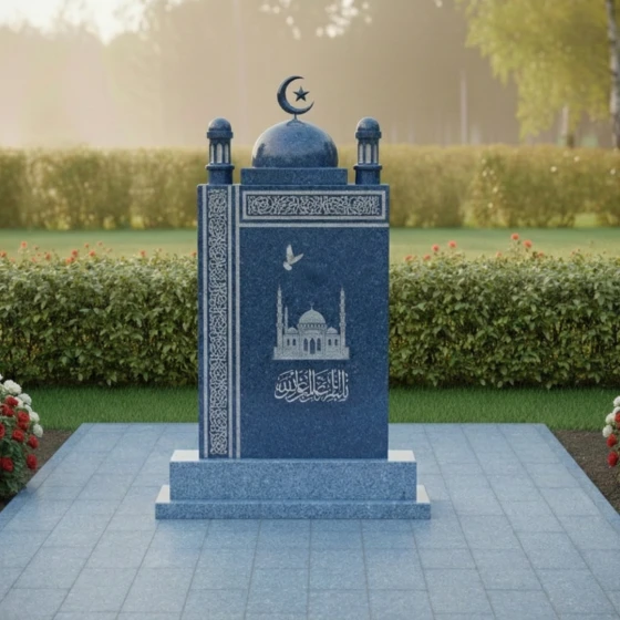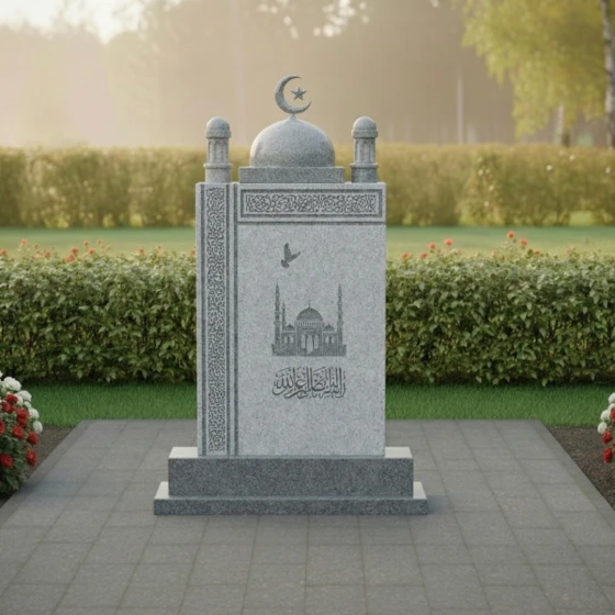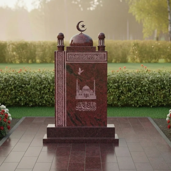 Данное изваяние представляет собой сложный архитектурный ансамбль, выполненный с ювелирной точностью. Центральная стела имеет строгую прямоугольную форму, которую венчает величественный купол, завершенный филигранно вырезанным мусульманским полумесяцем со звездой. По бокам от основного свода расположены декоративные элементы, имитирующие верхушки минаретов с имитацией ажурных решеток, что придает всей конструкции вид священного храма. Особое внимание стоит уделить обработке кромок: каждая фаска снята под идеальным углом, подчеркивая монументальность и четкость линий.