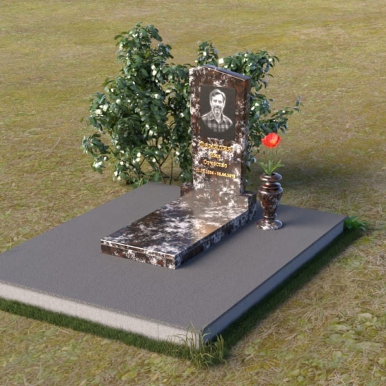 Этот гранитный монумент представляет собой композицию из двух основных элементов: вертикальной плиты с портретом и горизонтальной накладки. Вертикальная плита, возвышающаяся над землей, имеет строгую прямоугольную форму с небольшим скосом в верхней части. Это придает монументу сдержанную элегантность. Зеркальная полировка поверхности отражает свет, создавая ощущение глубины и сияния. На плите выгравирован портрет усопшего, выполненный с высокой точностью и вниманием к деталям. Ниже портрета располагается надпись с именем и датами жизни, выполненная золотым шрифтом. Горизонтальная накладка, расположенная в нижней части, также выполнена из черного полированного гранита и служит своеобразным пьедесталом для вертикальной плиты. Ее гладкая поверхность создает дополнительный контраст с окружающей средой. Рядом с монументом установлена ваза из черного гранита, предназначенная для живых цветов.