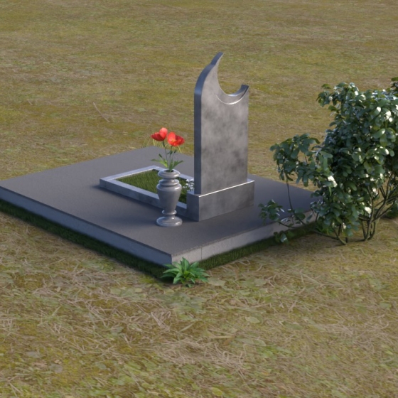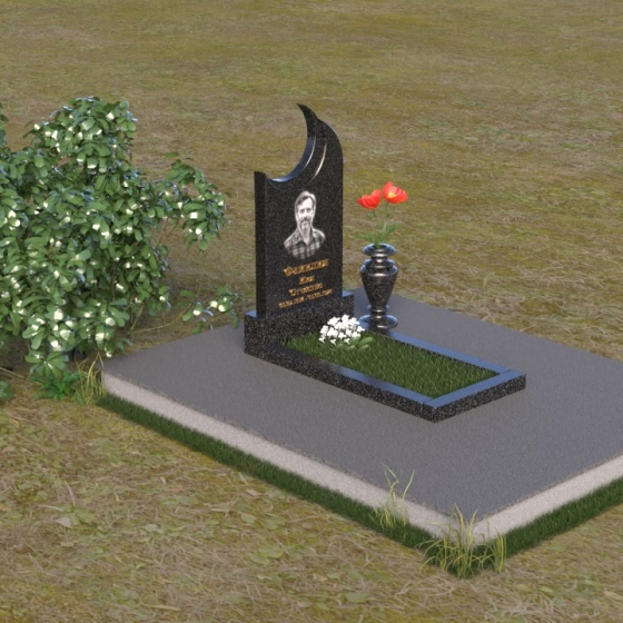 Этот гранитный монумент притягивает взгляд своей необычной формой. Основной элемент – вертикальная плита, увенчанная плавной, асимметричной дугой, напоминающей полумесяц. Её левая сторона чуть выше правой, что создает ощущение динамики и незавершенности, словно оборвавшейся жизни. Поверхность лицевой стороны отполирована до зеркального блеска, отражая небо и окружающий пейзаж, создавая иллюзию глубины и пространства. На полированной поверхности выгравирован портрет усопшего, надпись с именем и датами жизни. Нижняя часть монумента, сопрягаясь с горизонтальной плитой, образует единый ансамбль. Переход между вертикальной и горизонтальной плоскостями подчеркнут небольшой ступенькой, добавляющей конструкции объема. Горизонтальная плита, в свою очередь, также отполирована до блеска, отражая свет и усиливая эффект монументальности. Фаски на гранях плиты аккуратно обработаны, что придает памятнику завершенный и элегантный вид. Сбоку от монумента расположена небольшая гранитная ваза, предназначенная для живых цветов, которые станут символом вечной памяти и любви.