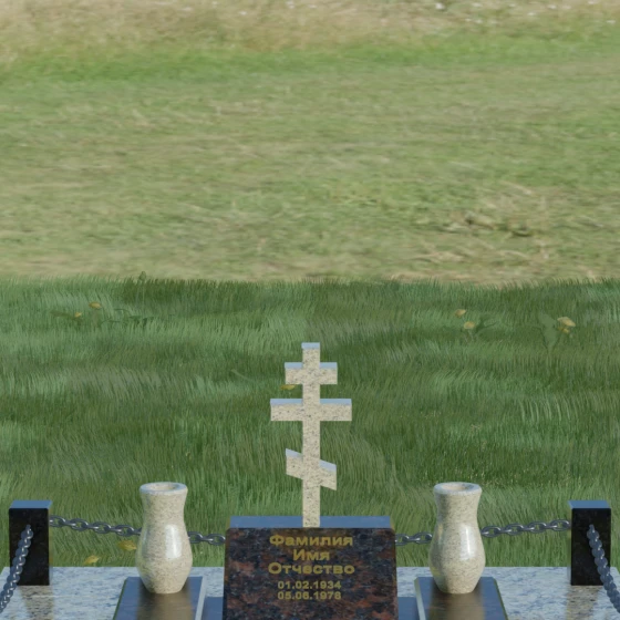 Особого внимания заслуживает художественная игра контрастов, реализованная в этой модели. Основная плита и декоративные элементы выполнены из глубокого черного камня с зеркальной полировкой, которая отражает окружающий мир, создавая эффект глубины. Стела имеет горизонтальную ориентацию, что позволяет разместить информацию максимально лаконично и читаемо. По обе стороны от центральной части расположены две изящные гранитные вазы, чьи плавные, точеные формы смягчают строгость прямых углов. Завершенность мемориальному комплексу придает массивное основание — надгробная плита, выполненная из гранита контрастного светлого оттенка. Такое решение не только эстетично, но и максимально практично: сплошное мощение участка полностью исключает рост сорной травы и необходимость сложного ухода за грунтом, сохраняя безупречный вид захоронения на десятилетия.
