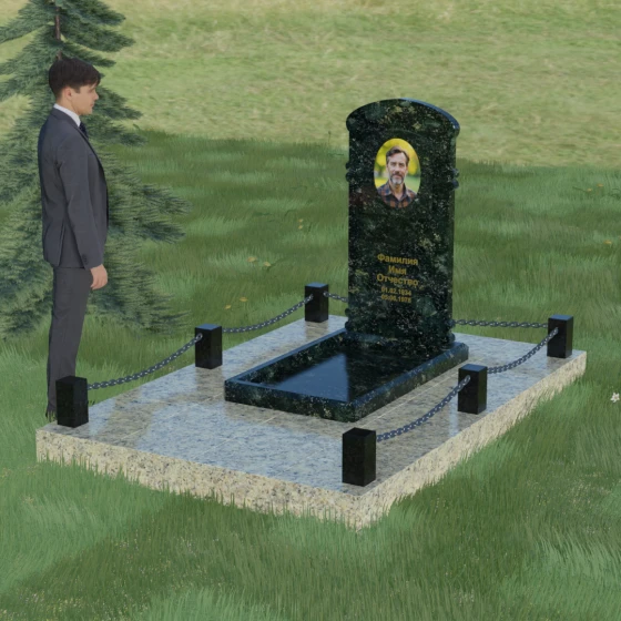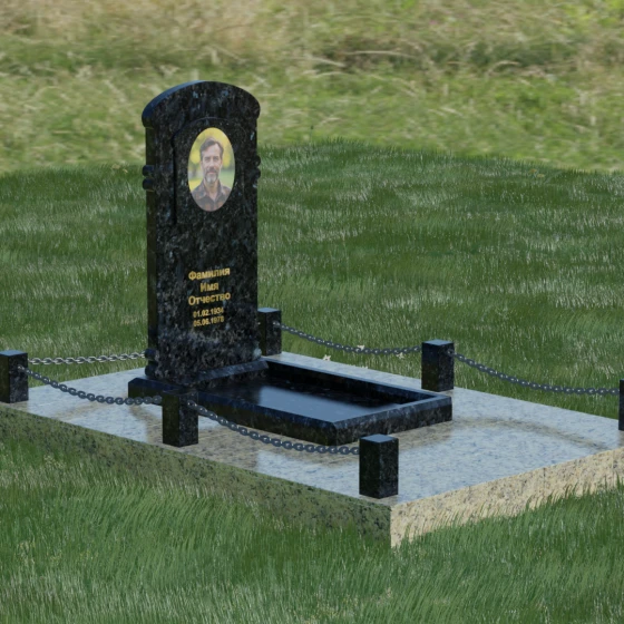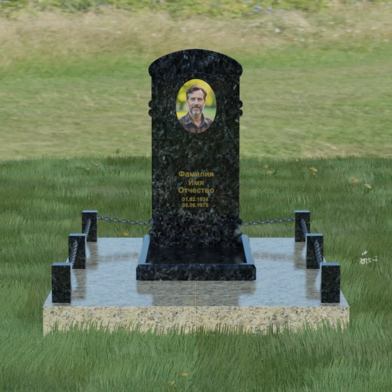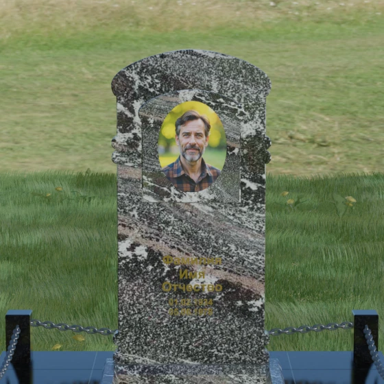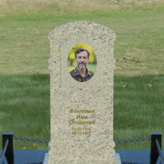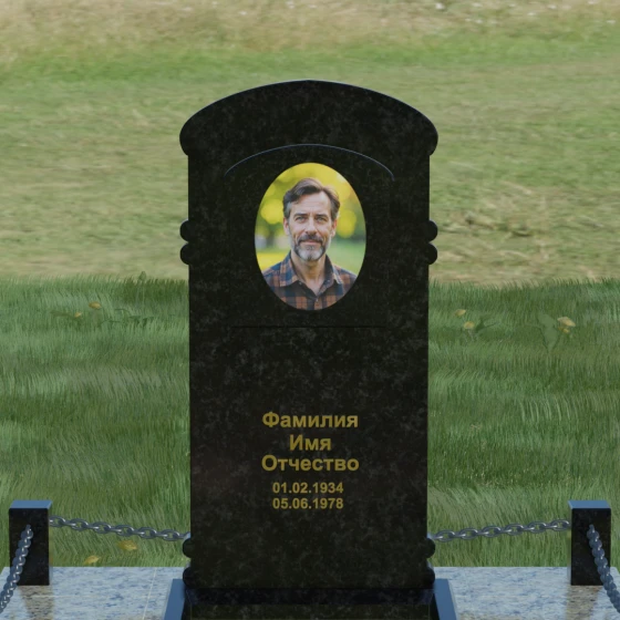 Представленная мемориальная композиция — это воплощение архитектурного баланса, где строгость классических форм встречается с мягкостью художественных линий. В центре ансамбля находится вертикальная стела с уникальной геометрией: её верхняя грань образует пологую, торжественную арку, которая плавно переходит в декоративные выступы на боковых гранях. Особенностью модели является глубокая резная ниша в форме идеального овала, создающая естественное обрамление для портрета. Внутренняя дуга, вырезанная в теле камня над портретной зоной, имитирует свод священной арки, придавая изделию объем и глубину. Зеркальная полировка основной плоскости создает глубокий, почти мистический блеск, в котором отражается небо, подчеркивая монументальность и чистоту исполнения каждой детали.