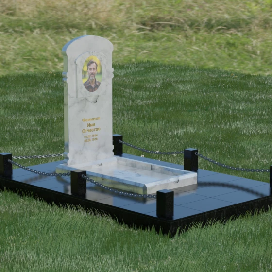 Благоустройство участка продумано до мелочей и формирует законченное сакральное пространство. Основание мемориала установлено на массивный гранитный цоколь, который служит надежным фундаментом и защищает конструкцию от сезонных изменений почвы. Территория полностью облицована широкоформатными полированными плитами — такое решение не только придает эстетическую завершенность, но и гарантирует безупречный вид участка на десятилетия, сводя уход за ним к минимуму. По периметру установлены строгие квадратные столбики из камня, соединенные декоративными цепями. Эта деталь визуально очерчивает границы личного пространства, создавая атмосферу уединения и покоя, отделяя место памяти от остального мира.