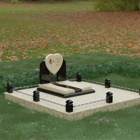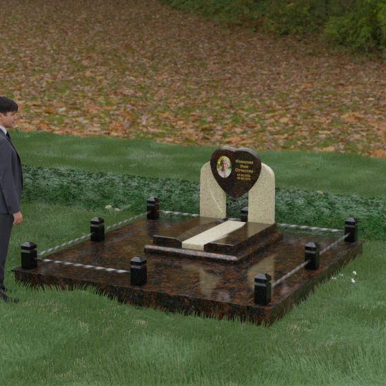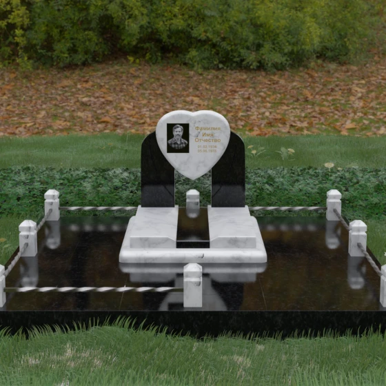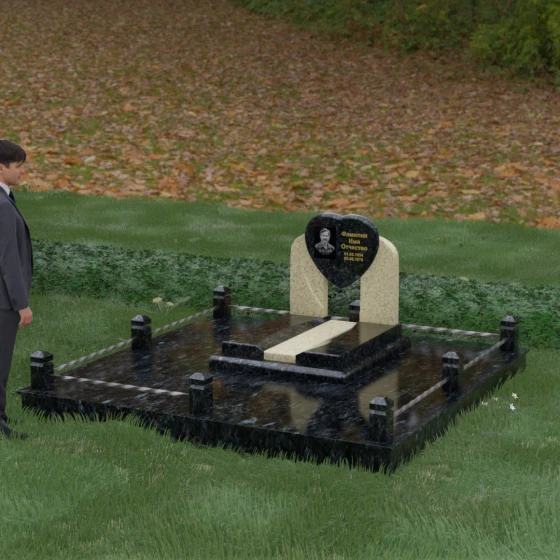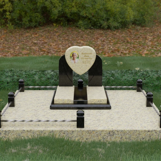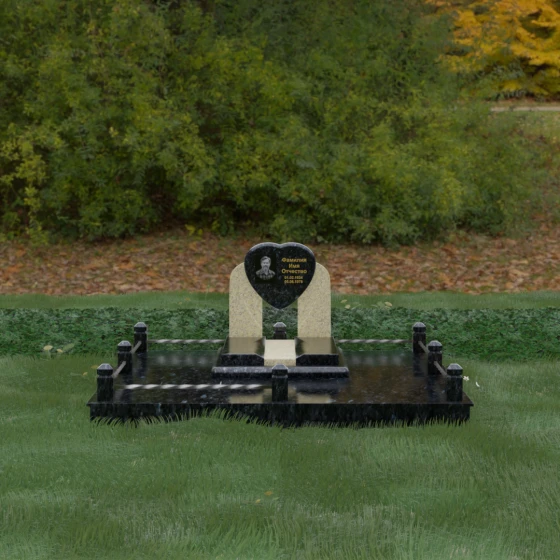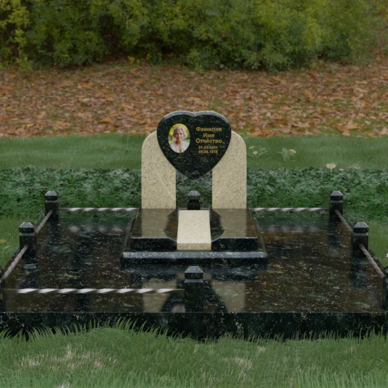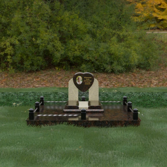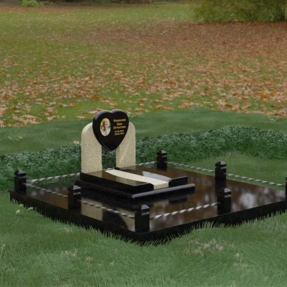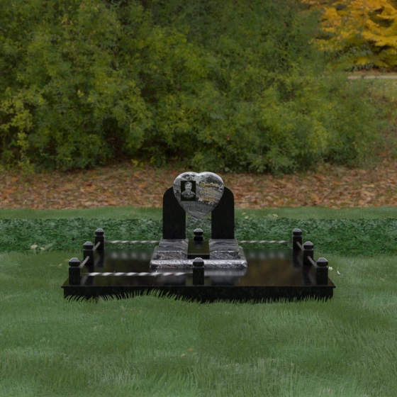 Геометрия стелы в форме сердца является идеальным местом для размещения портрета. Благодаря большой площади центральной части, здесь можно расположить как классическую гравировку, так и цветную фотокерамику, которая будет смотреться особенно эффектно на контрастном фоне. Светлые вставки в основании и на надгробной плите создают визуальную дорожку, ведущую взгляд к самому важному — лицу и имени близкого человека. Благоустройство участка продумано до мелочей: по периметру установлен массивный цоколь, облицованный плитами, что полностью исключает прорастание травы и упрощает уход за местом захоронения. Низкое ограждение, состоящее из полированных каменных столбиков с декоративной фаской и витых металлических стержней, изящно очерчивает границы, не перегружая пространство.