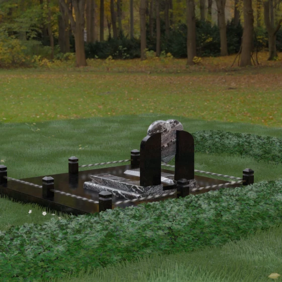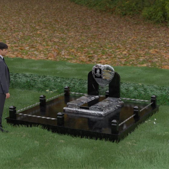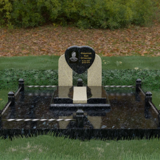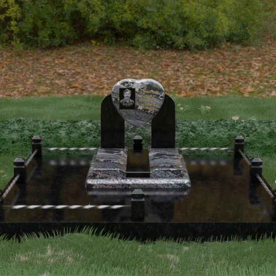 Данное ритуальное изделие представляет собой сложную архитектурную композицию, в центре которой заложена глубокая символика вечной любви и преданности. Форма сердца, изящно вписанная в обрамление из двух симметричных стел, напоминающих крылья или арку, создает ощущение защищенности и трепета. Выбор этой модели продиктован желанием выразить самые искренние чувства: плавные линии центрального элемента смягчают строгость камня, а многоуровневая структура основания придает мемориалу величественный и законченный вид. Это не просто памятный знак, а гармоничное пространство, где каждый элемент — от изгиба полированной грани до массивного цоколя — работает на создание атмосферы светлой памяти.