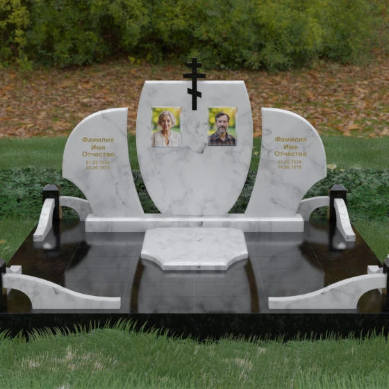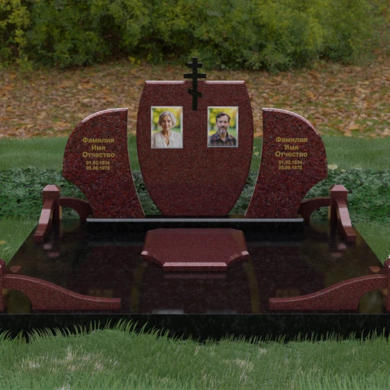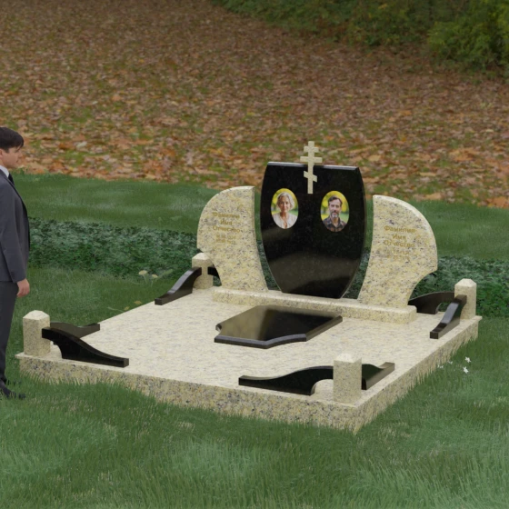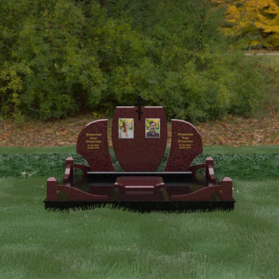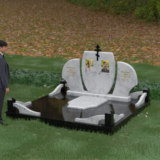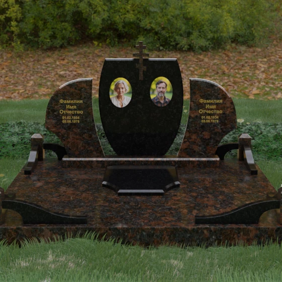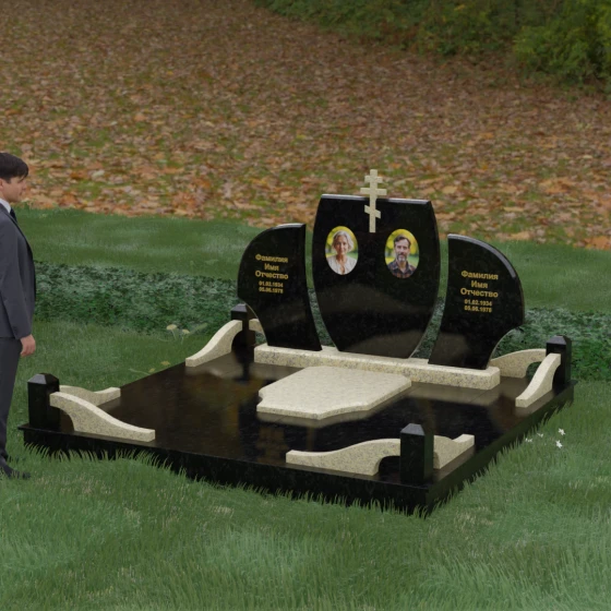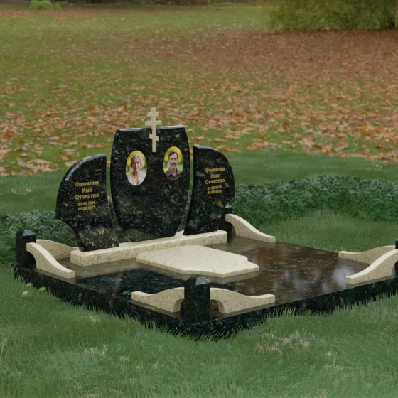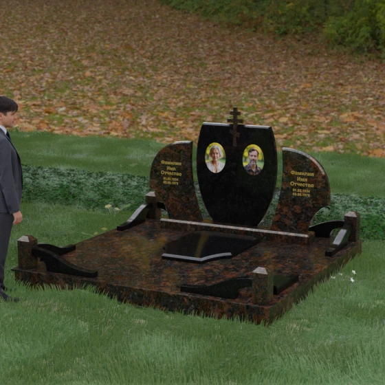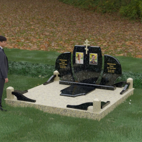 Оформление: для данной формы мы рекомендуем использовать технику глубокой гравировки ФИО с последующим нанесением сусального золота — это подчеркнет благородство темного камня. Овальные фотокерамические портреты идеально размещаются на центральной стеле, сохраняя композиционное равновесие, а золоченый крест визуально объединяет портреты в общую семейную историю.