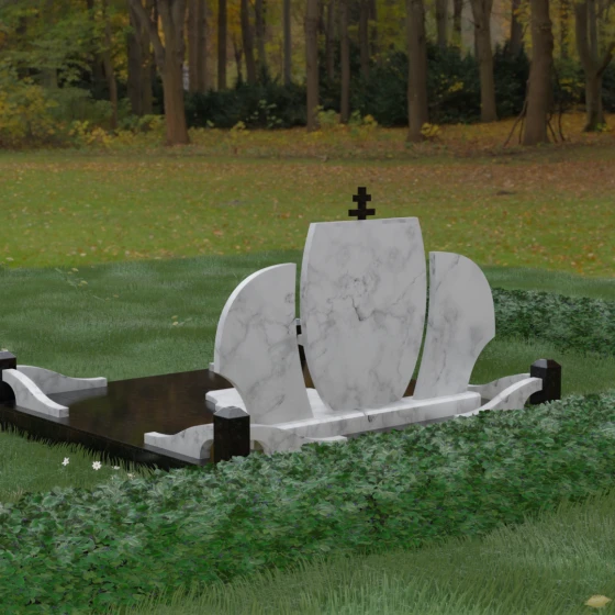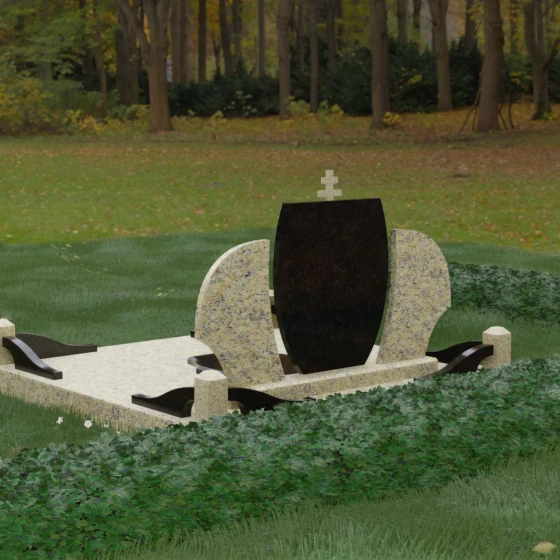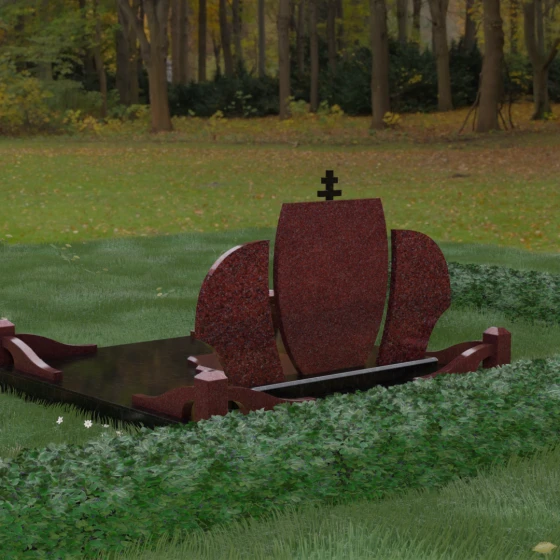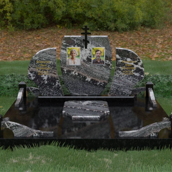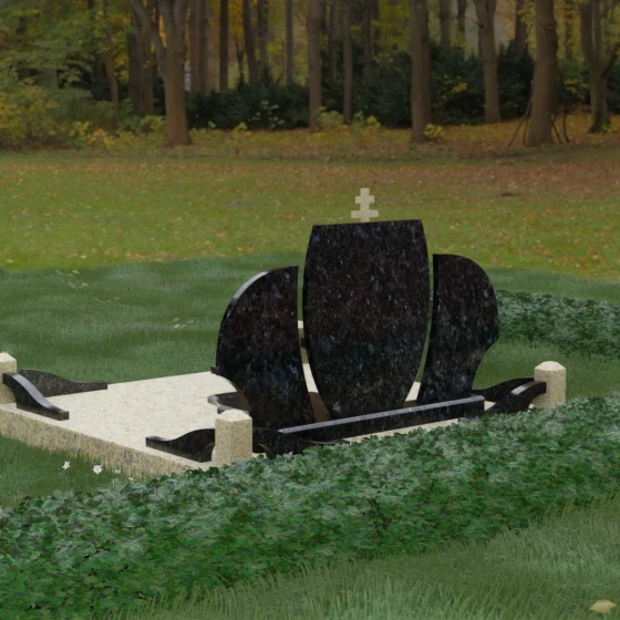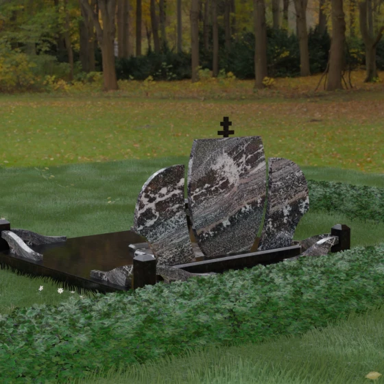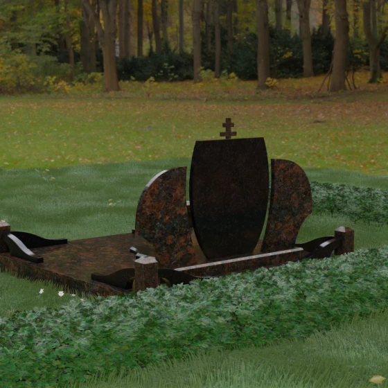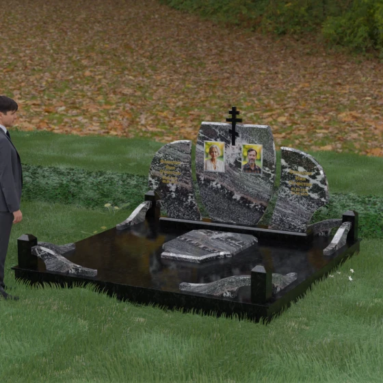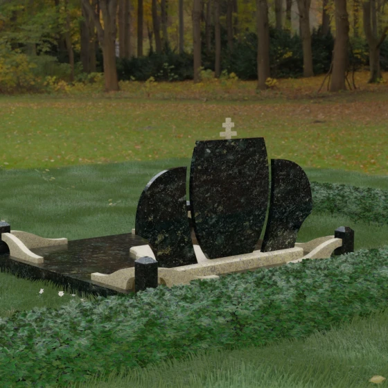 Данное ритуальное изделие представляет собой сложную архитектурную композицию, спроектированную по строгим законам симметрии и эстетического баланса. В центре ансамбля расположена доминирующая стела, чьи очертания напоминают одновременно и защитный щит, и лепестки раскрывающегося цветка. Венчает центральный элемент лаконичный восьмиконечный православный крест, выполненный в контрастном светлом оттенке, что делает его духовным ориентиром всей конструкции. Две боковые стелы, исполненные в форме изящных симметричных крыльев, плавно расширяются кверху, создавая гармоничный визуальный ритм и расширяя пространство для мемориальных надписей. Мастера уделили особое внимание филигранной обработке граней: зеркальная полировка основных плоскостей эффектно контрастирует с матовыми фасками, заставляя свет преломляться под разными углами и создавая глубокий эффект объема и трехмерности.