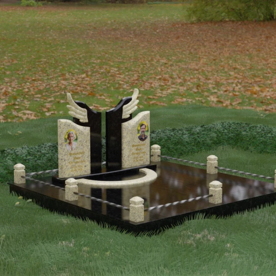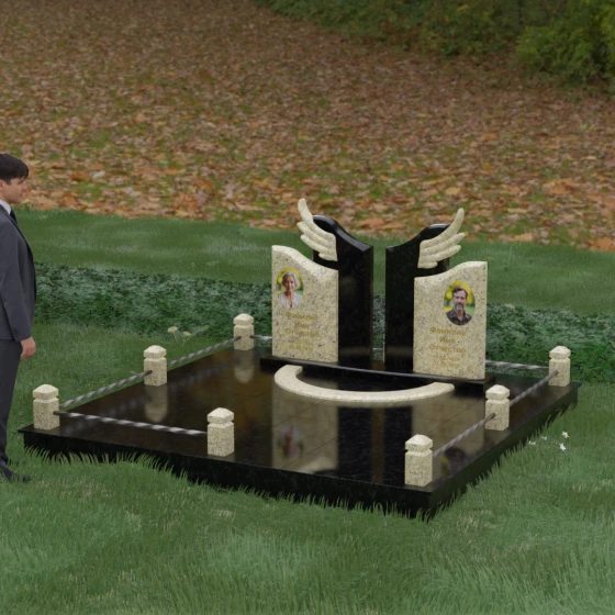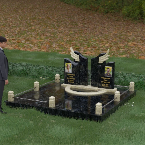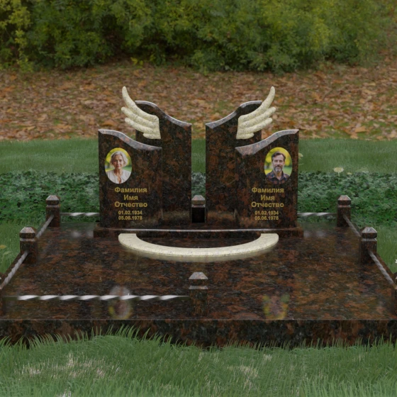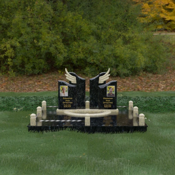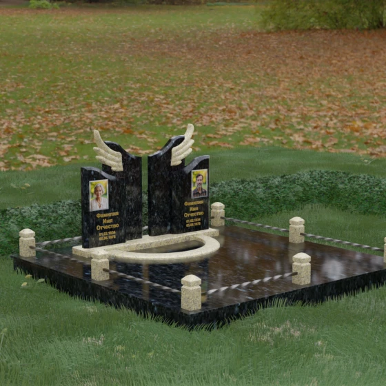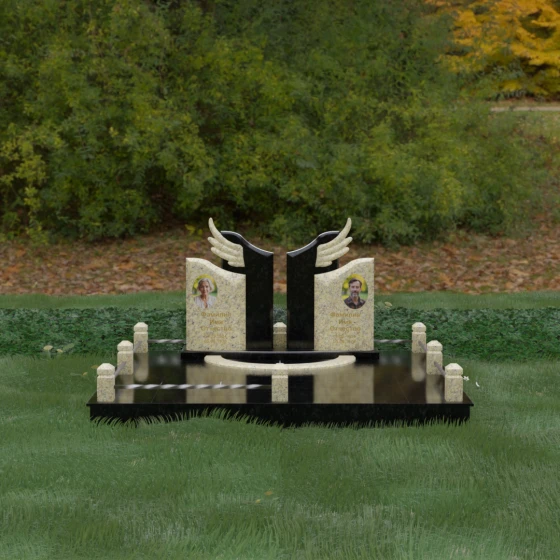 Боковые элементы композиции, выполненные из светлого камня с мягкой зернистой текстурой, несут в себе тепло и светлую память. Их форма напоминает раскрытые свитки или лепестки экзотического цветка, на которых гармонично располагаются портреты и памятные надписи. Отсутствие острых, агрессивных углов в верхней части этих изваяний подчеркивает смирение и покой. Весь ансамбль пронизан идеей дуальности: светлого и темного, земного и небесного, что делает эту модель идеальным выбором для оформления семейного захоронения, где двое близких людей обретают вечный приют под общим кровом божественной защиты.