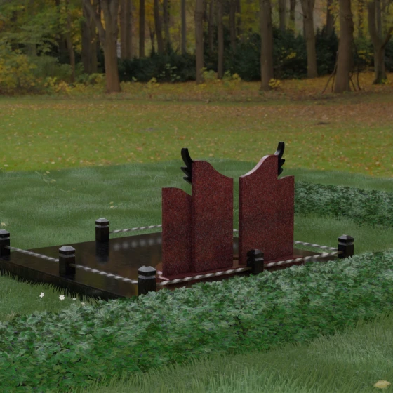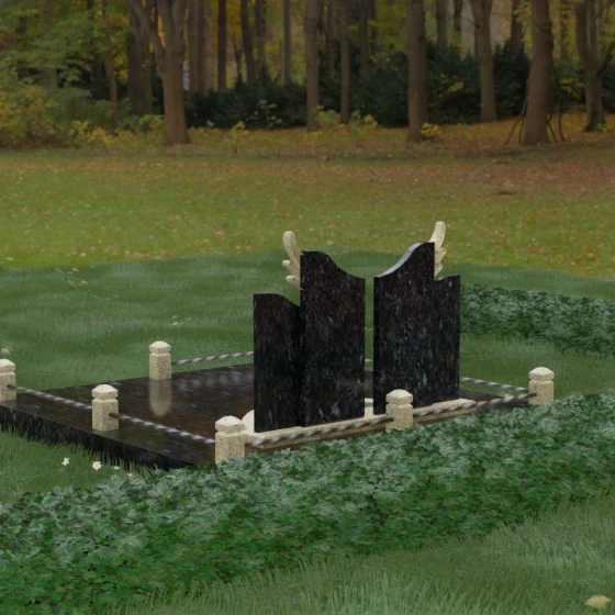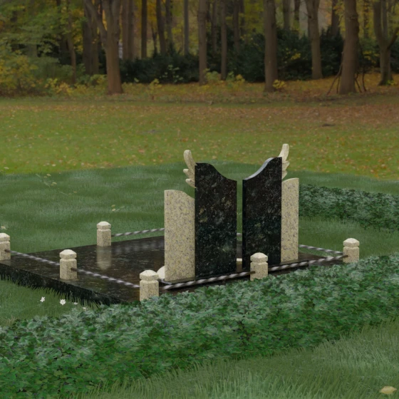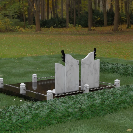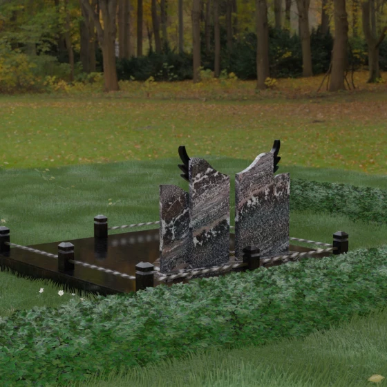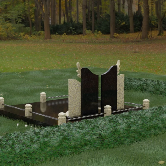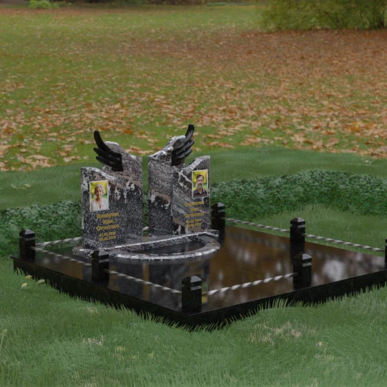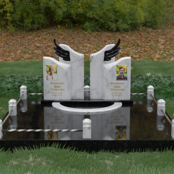 Данная художественная композиция представляет собой не просто мемориал, а глубокое философское размышление о вечности, единстве душ и небесном покровительстве. В центре ансамбля возвышается гранитный монумент, состоящий из двух зеркально расположенных обелисков глубокого черного цвета. Главным смысловым акцентом здесь выступают искусно вырезанные белоснежные крылья, венчающие темные вертикальные плиты. Каждое перо этих крыльев проработано с ювелирной точностью: плавные, стремящиеся ввысь линии символизируют освобождение духа и его полет в высшие сферы. Контраст между угольно-черной зеркальной полировкой основного камня и светлой, почти светящейся фактурой резных элементов создает динамику света и тени, приковывая взгляд и заставляя задуматься о торжественности момента.