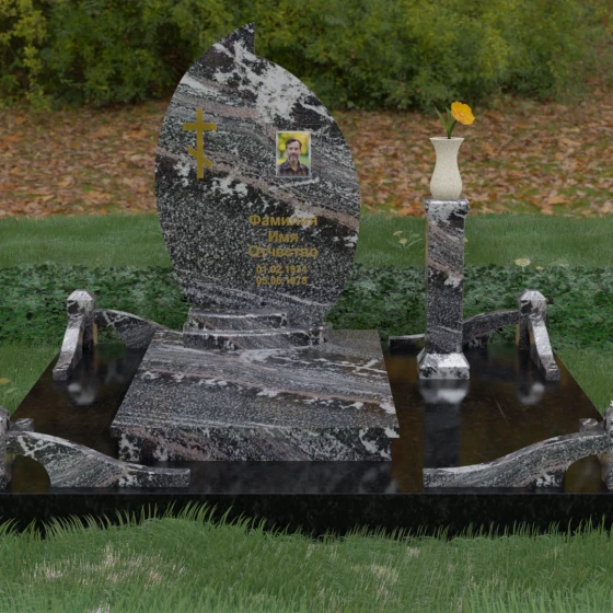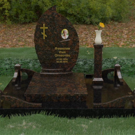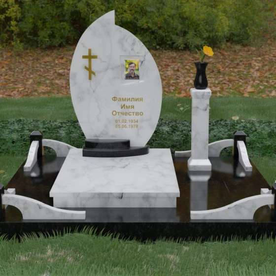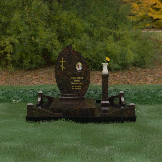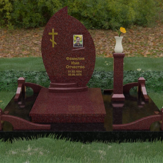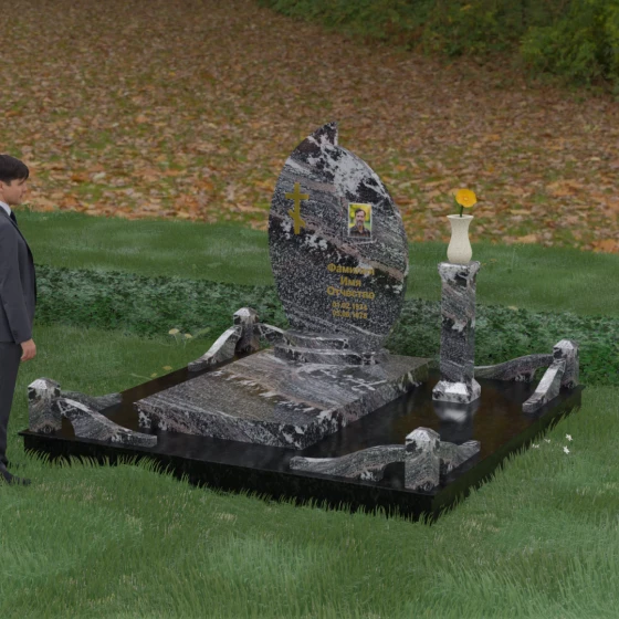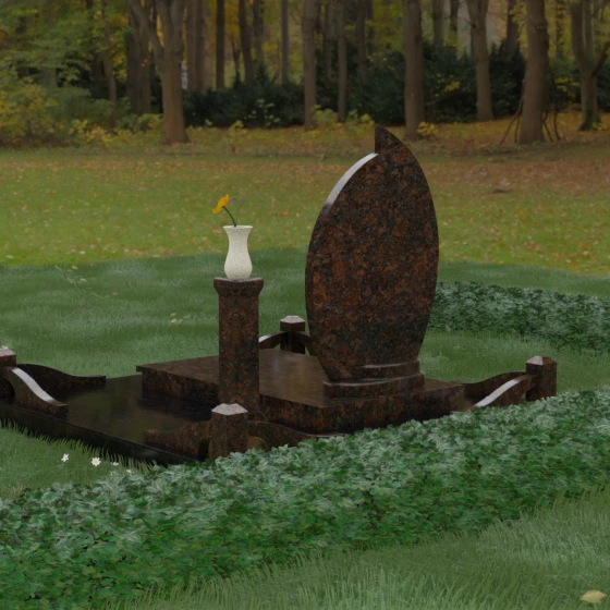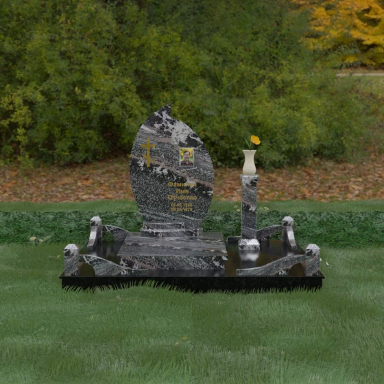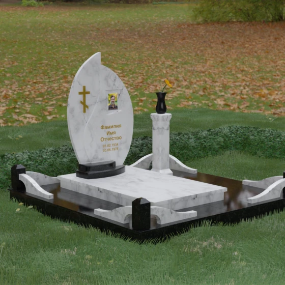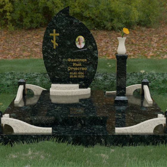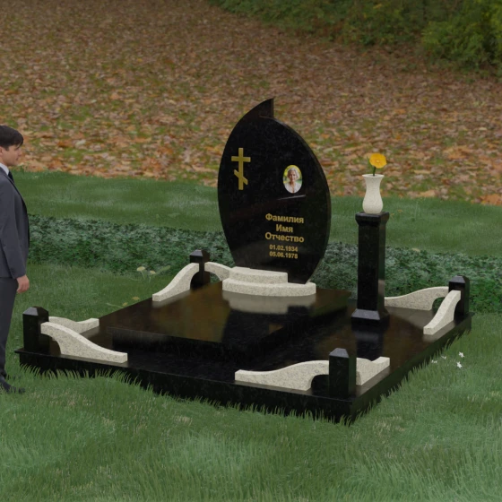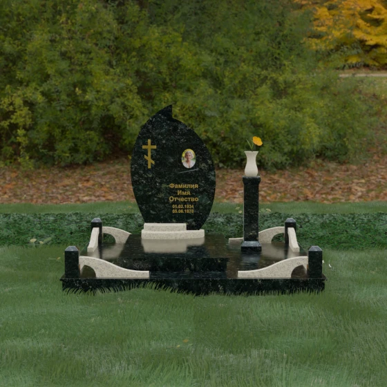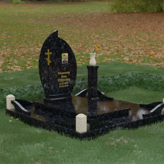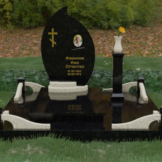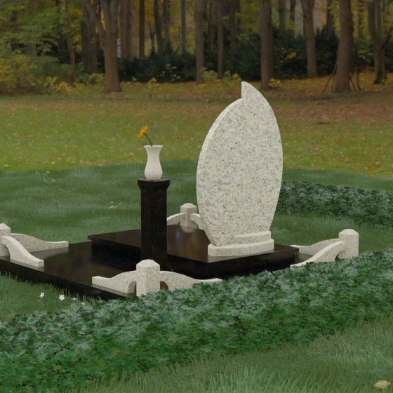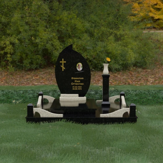 Выбор мемориального ансамбля — это всегда поиск баланса между эстетикой и долговечностью. Данная модель (Артикул 232) представляет собой сложную многокомпонентную композицию, центром которой является величественная стела, выполненная в уникальной асимметричной форме. Своими очертаниями она напоминает застывшее пламя или лепесток, устремленный ввысь, что символизирует вечную жизнь души и неугасаемую память близких. Плавный изгиб верхней грани завершается острым пиком, создавая динамичный и в то же время одухотворенный силуэт. Мастерская обработка камня позволяет добиться идеальной зеркальной полировки основной плоскости, которая эффектно контрастирует с матовыми светлыми элементами подставки и ограждения.