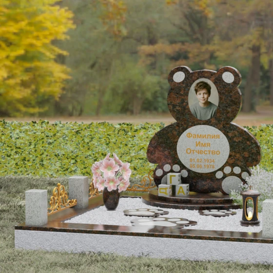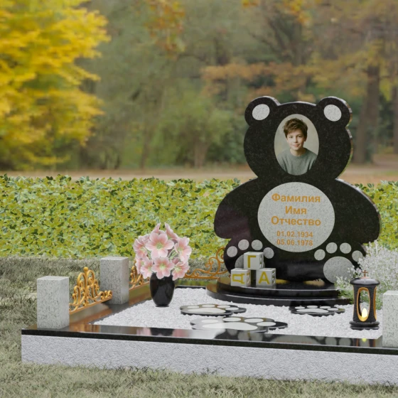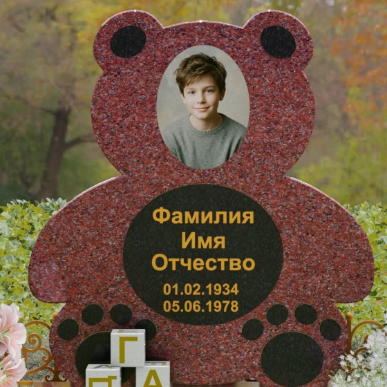 Представленное надгробие из натурального камня (Артикул 235) — это подлинное произведение мемориального искусства, в котором монументальность гранита встречается с трогательной нежностью художественного образа. Силуэт памятника выполнен в форме стилизованной фигуры медвежонка, что мгновенно переводит восприятие из плоскости строгой скорби в область светлых, чистых воспоминаний о невинности и искренности. С точки зрения искусствоведа, выбор такой формы является глубокой аллегорией вечной защиты и неувядающей любви: округлые, мягкие линии стелы лишены острых углов, что символизирует бесконечность и гармонию.