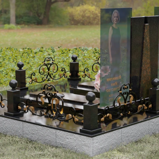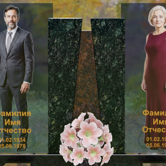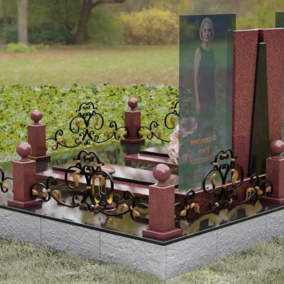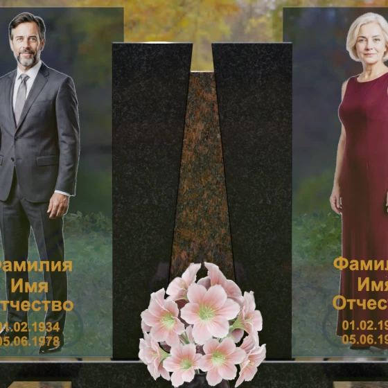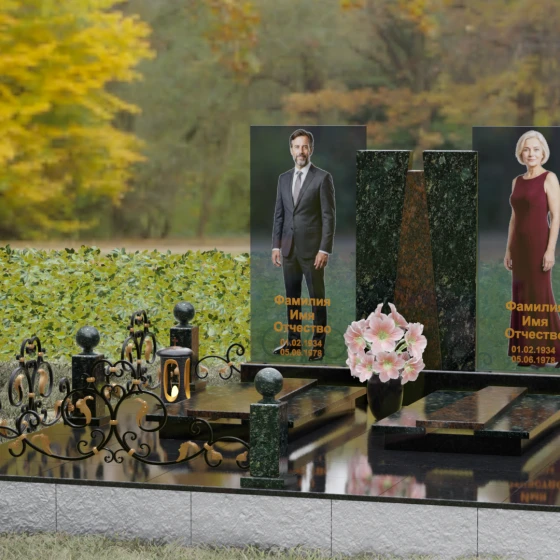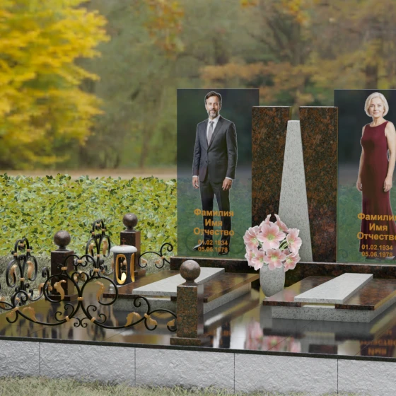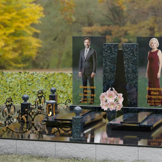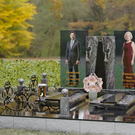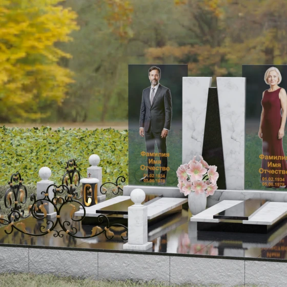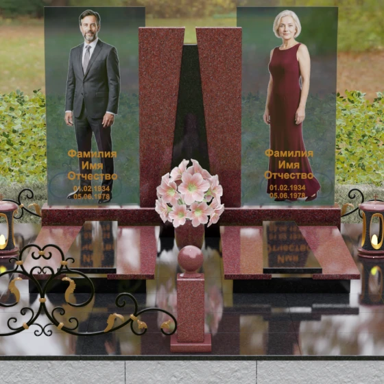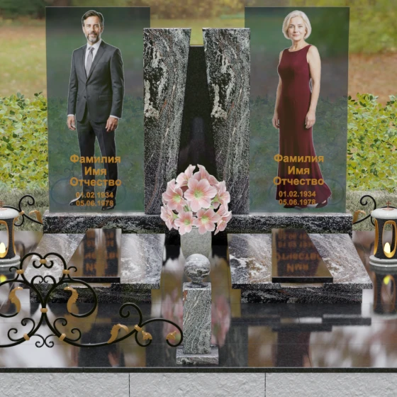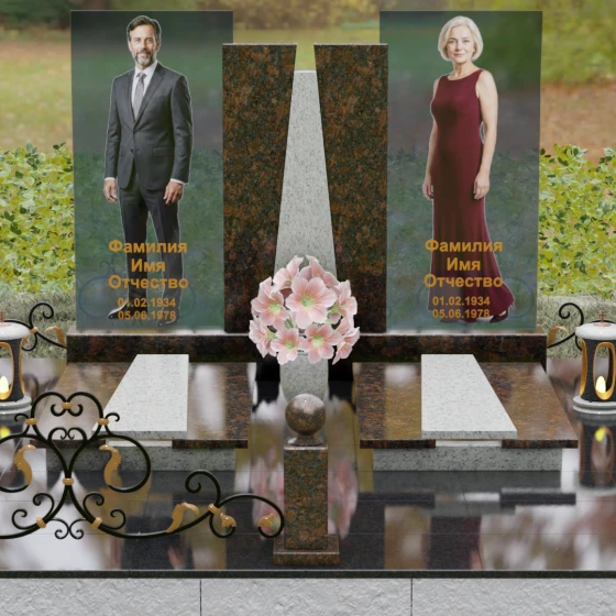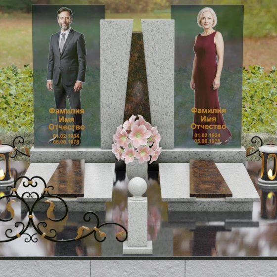 Кому подойдет: Эта монументальная композиция разработана для семейного захоронения двух человек (супругов, родителей). Она станет идеальным выбором для тех, кто ищет современное, статусное решение в стиле модерн, где классическая надежность гранита сочетается с художественной легкостью стеклянных элементов. Благодаря возможности выбора цвета камня, модель универсальна: в светлом исполнении (мрамор Тассо или Мансуровский гранит) она выглядит возвышенно и легко, а в темных тонах Габбро или Лезниковского гранита приобретает черты величественного склепа.
