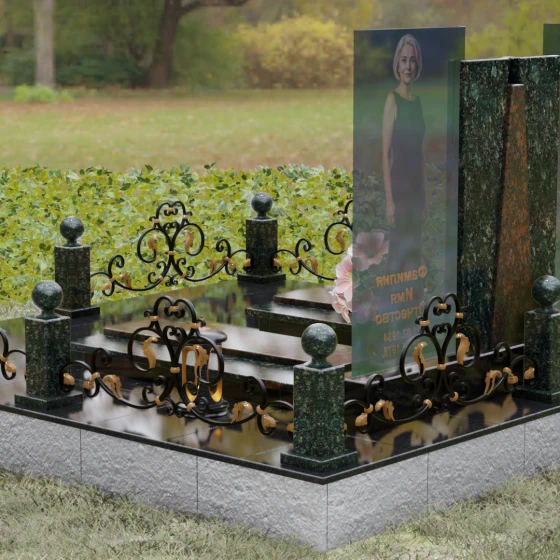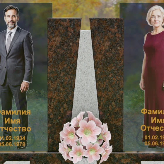 Центральным элементом ансамбля выступает трехсоставная стела, поражающая своей выверенной геометрией. В сердце композиции расположен массивный гранитный пилон, разделенный на две симметричные части клиновидной вставкой из контрастного камня. Этот «врез» создает мощный визуальный акцент, символизирующий светлую память, пробивающуюся сквозь толщу времени. По бокам от центрального монолита установлены высокотехнологичные панели из закаленного многослойного стекла. На них нанесены ростовые портреты, которые благодаря прозрачности материала кажутся объемными и живыми. Каждая грань камня проходит многоступенчатую обработку, достигая идеальной прямолинейности, что подчеркивает современный, «европейский» характер этого надгробного сооружения.