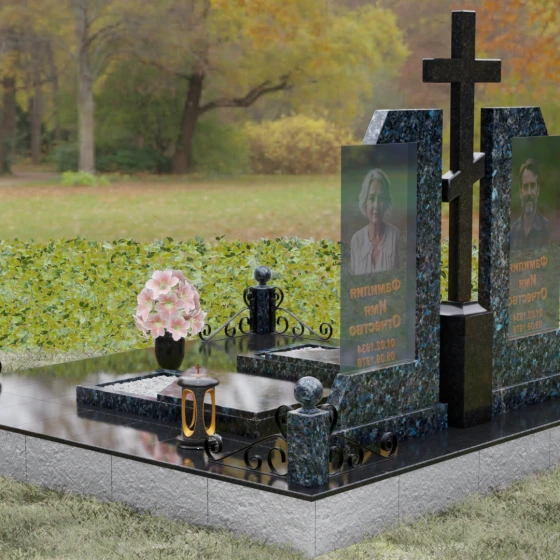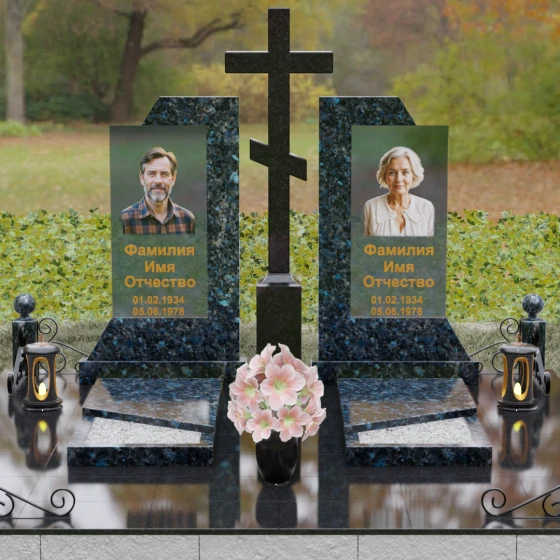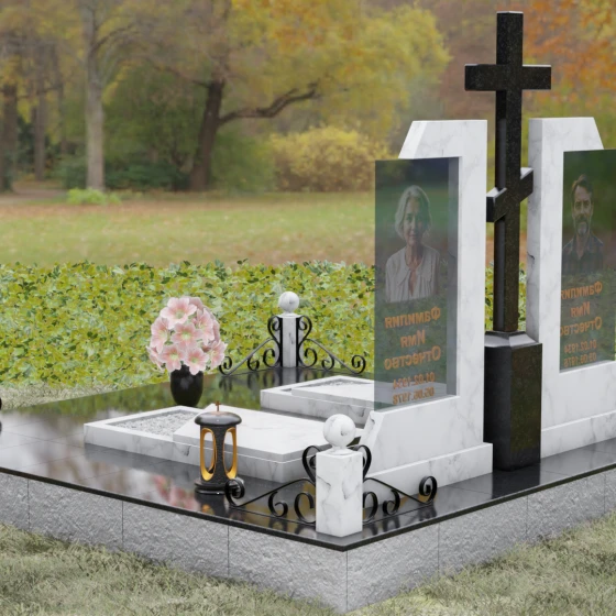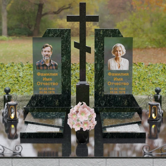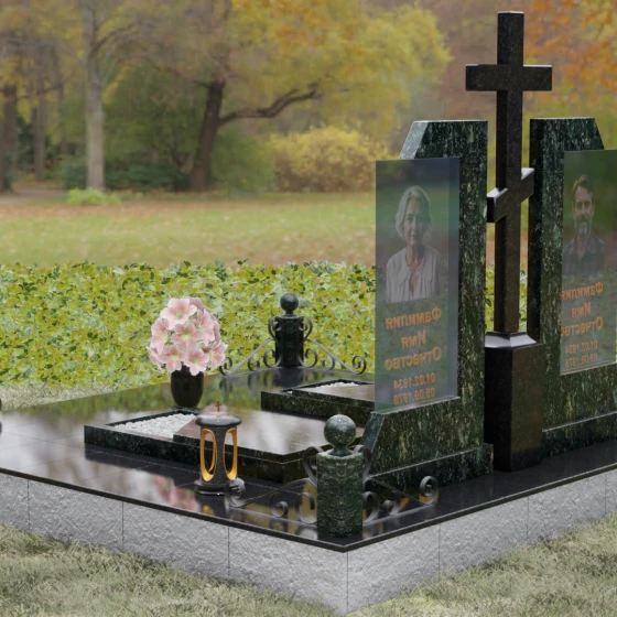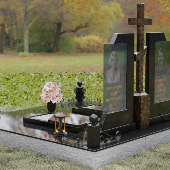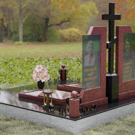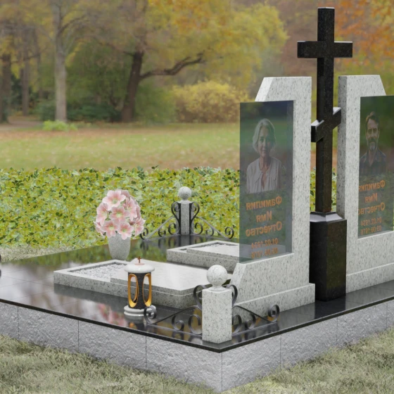 Каждая деталь этой модели пронизана глубокой символикой. Две парные колонны олицетворяют неразрывную связь душ, единство жизненного пути и взаимную поддержку, которая продолжается даже за гранью земного бытия. Центральный крест здесь выступает не только как конфессиональный маркер, но и как «Древо Жизни», защищающее и объединяющее близких под своей сенью. Сочетание тяжелого, незыблемого камня и прозрачного, почти эфирного стекла символизирует встречу материального и духовного миров. Этот гранитный монумент внушает чувство защищенности и нерушимости памяти, которая не подвластна тлену.