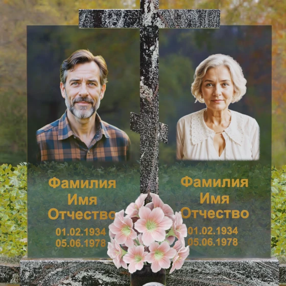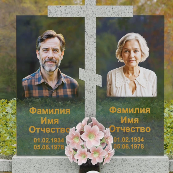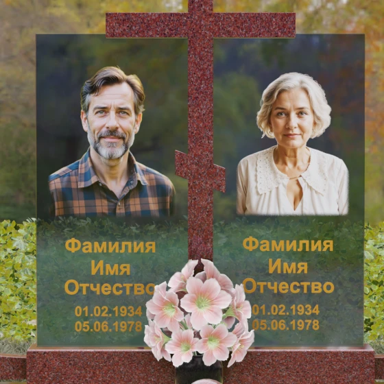 Особое внимание уделено контрасту фактур. Глубокий, насыщенный цвет основного камня противопоставлен прозрачности и легкости комбинированных вставок, на которых размещаются портреты. Грани каждой детали обработаны методом алмазного шлифования, что исключает появление микротрещин и гарантирует сохранение первозданного блеска на столетия. Нижняя часть мемориала поддерживается массивным основанием, переходящим в художественно оформленный цоколь.
