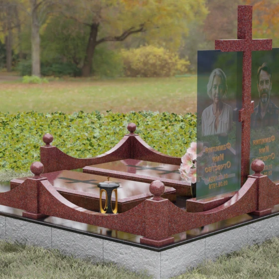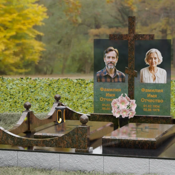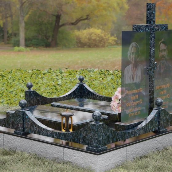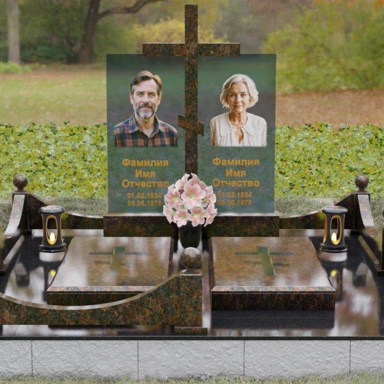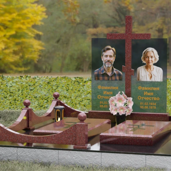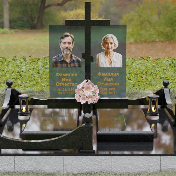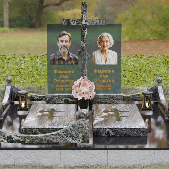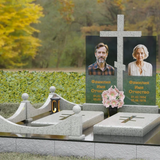 Данная модель олицетворяет собой концепцию «семейного пристанища». Горизонтальная направленность комплекса и объединение двух стел общим крестом символизируют единство душ и защиту свыше. Благоустройство участка продумано до мелочей: по периметру установлен низкий гранитный бордюр, угловые элементы которого украшены декоративными полированными шарами — символами завершенности и бесконечности бытия. В передней части установлены изящные каменные лампадки, предназначенные для ритуального огня, и массивная ваза с мягкими, округлыми формами, которая уравновешивает строгость прямых линий стелы. Полное отсутствие открытого грунта благодаря мощению плитами обеспечивает чистоту и минимизирует необходимость в сложном уходе, сохраняя эстетику места поклонения десятилетиями.
