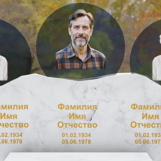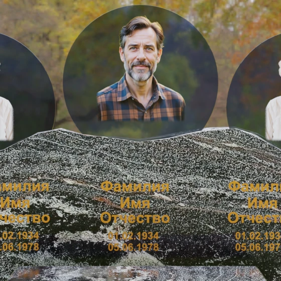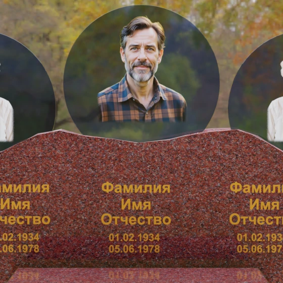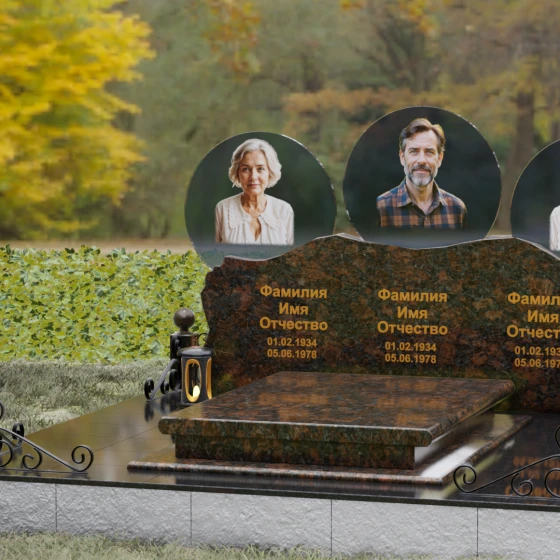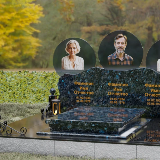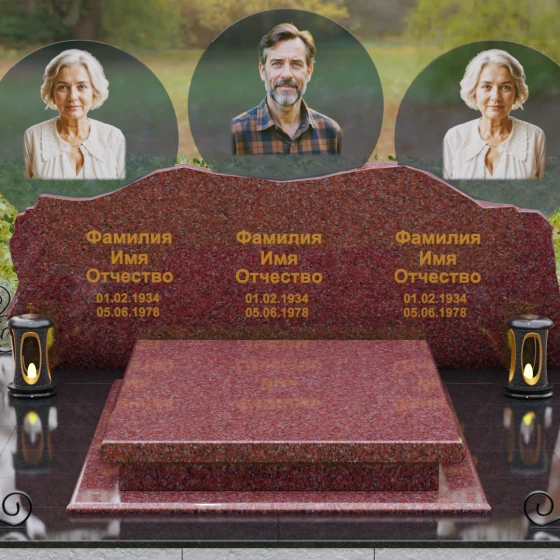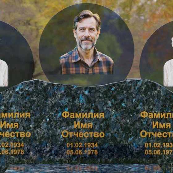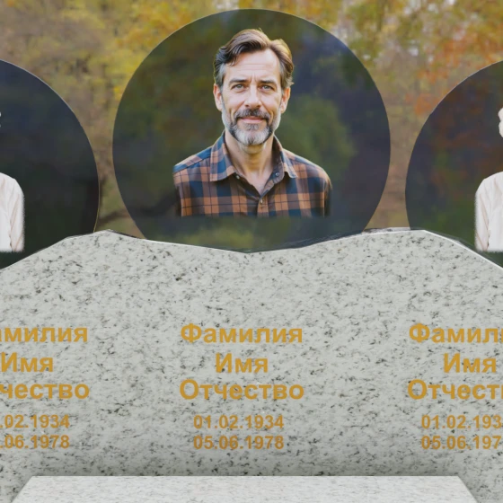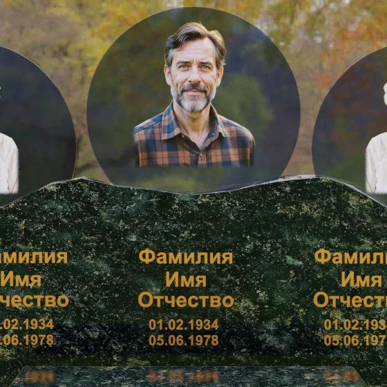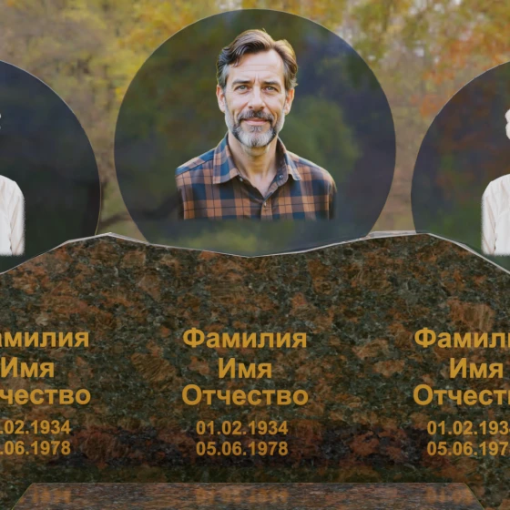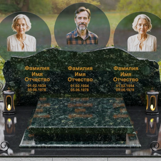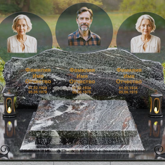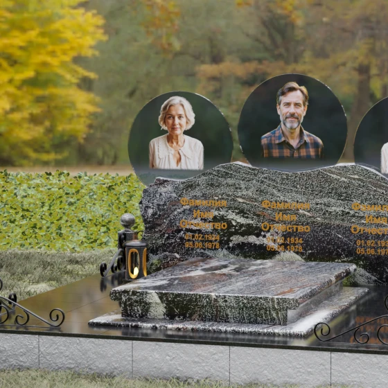 Этот гранитный монумент — истинное воплощение семейного единства, запечатленное в камне. Его горизонтальная архитектура, рассчитанная на три персоны, символизирует неразрывную связь поколений и вечный покой в лоне природы. Главной художественной доминантой выступает сложная геометрия верхней грани: вместо привычных строгих линий мы видим экспрессивный, «рваный» край, имитирующий очертания скалистых гор. Такая техника обработки, называемая «скала», создает мощный архетипический образ незыблемости и первозданной силы. Зеркальная полировка лицевой поверхности вступает в эффектный диалог с фактурным, необработанным верхним срезом, подчеркивая благородство материала. Три круглых медальона с портретами, словно три небесных светила, возвышаются над основным массивом, создавая ощущение легкости и устремленности ввысь, несмотря на монументальность конструкции. Золоченая гравировка имен выполнена глубоким академическим шрифтом, который мягко сияет при любом освещении, напоминая о внутреннем свете ушедших близких.