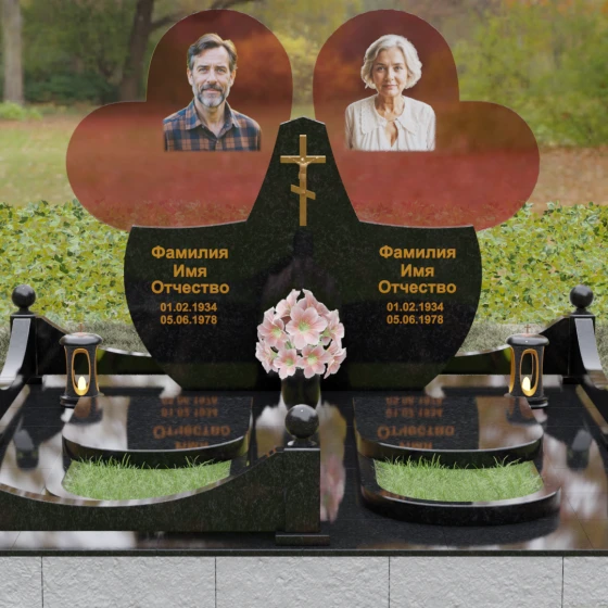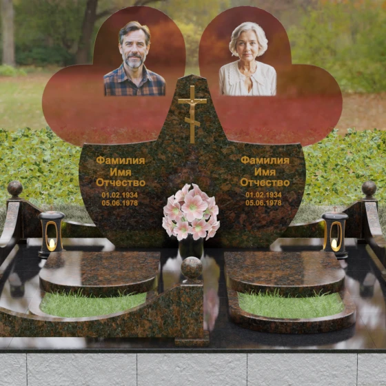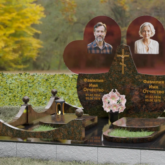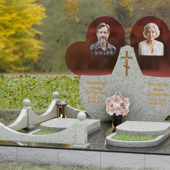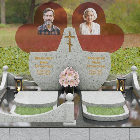 Форма двойного сердца выбрана не случайно — она символизирует неразрывную связь двух людей, чей жизненный путь был общим. Плавные волны верхней кромки изваяния вызывают чувство умиротворения и покоя, а мощное основание говорит о надежности и незыблемости памяти. Мемориал установлен на массивный гранитный цоколь, обеспечивающий безупречную устойчивость всей конструкции на десятилетия.