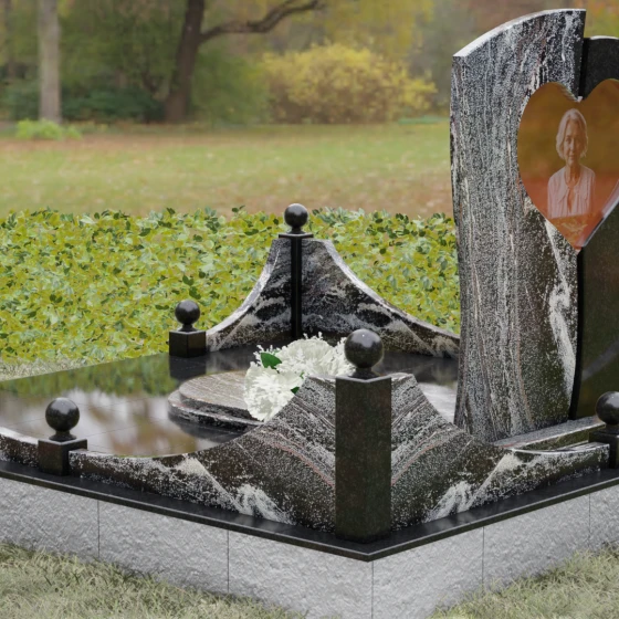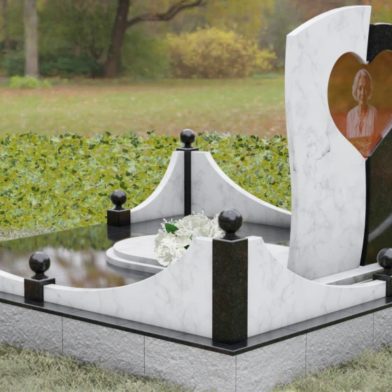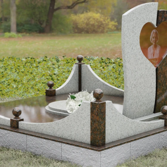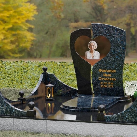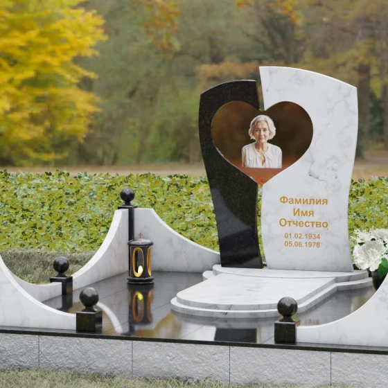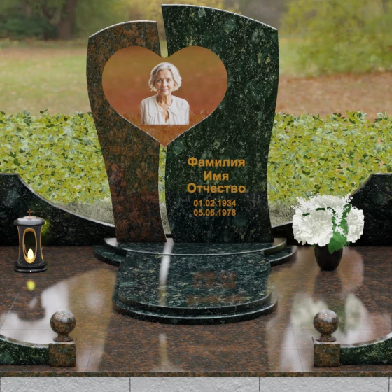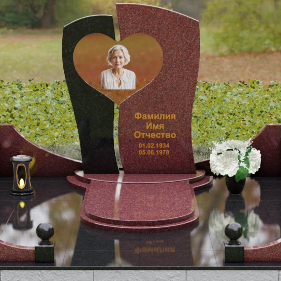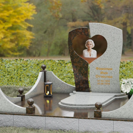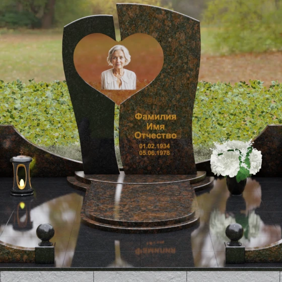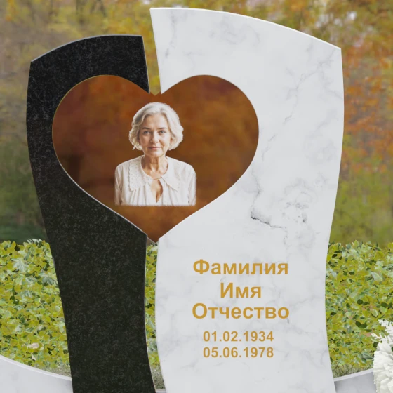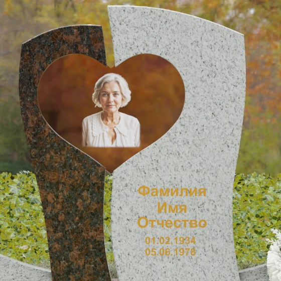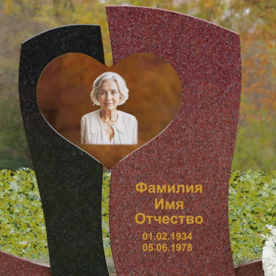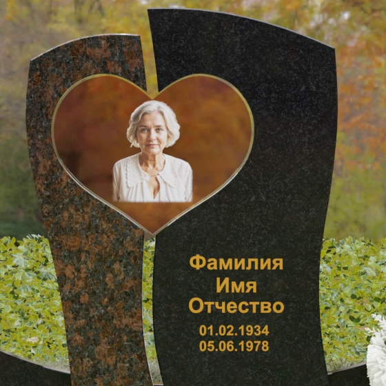 Эксклюзивный памятник (Артикул 259) — это не просто монумент, а глубокое художественное высказывание, воплощенное в благородном материале. Центральной темой композиции является безусловная любовь и единство душ, что находит свое отражение в уникальной форме стелы. Две асимметричные части монумента, выполненные из контрастных видов камня, плавно сходятся друг к другу, образуя в центре идеально выверенный силуэт сердца. Этот просвет служит своеобразным «окном в вечность», обрамляющим портрет близкого человека. Мягкие, волнообразные изгибы верхних граней символизируют жизненный путь — порой тернистый, но завершающийся покоем и гармонией. Тщательная зеркальная полировка лицевых поверхностей создает игру бликов, в которой отражается мир, подчеркивая живую связь между прошлым и настоящим.