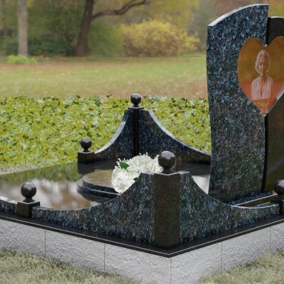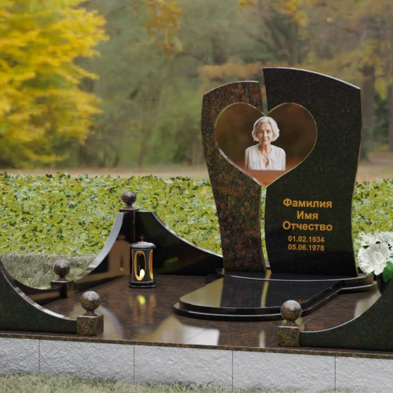 Оформление: Данная форма идеально подходит для размещения портрета в центре «сердца». Мы рекомендуем использовать керамику высокого разрешения или художественную гравировку с последующим покрытием «антидождь». Золоченая гравировка ФИО (как представлено на образце) на темном фоне камня выглядит особенно торжественно и благородно, гармонируя с теплыми оттенками комбинированных вставок. Завершенность участку придает надгробная плита, полностью закрывающая грунт: это не только выглядит эстетично и чисто, но и значительно упрощает уход за местом захоронения, избавляя от необходимости борьбы с сорняками.