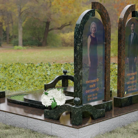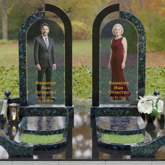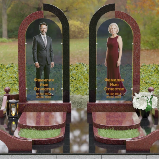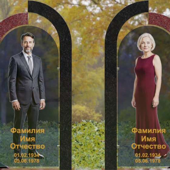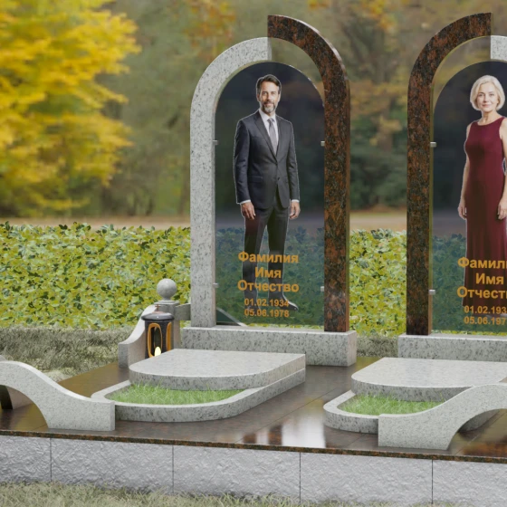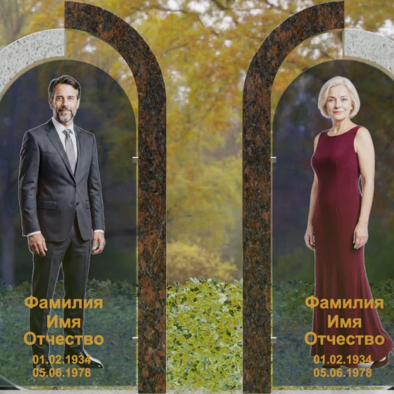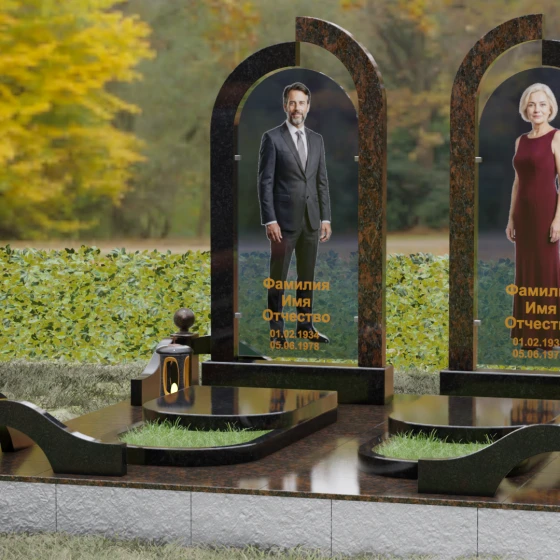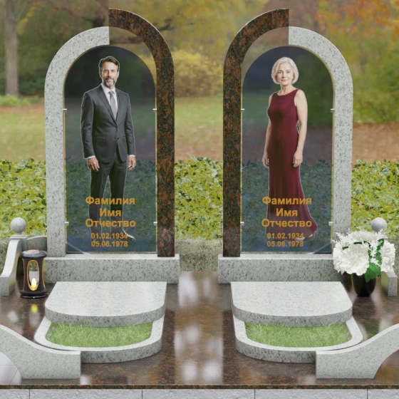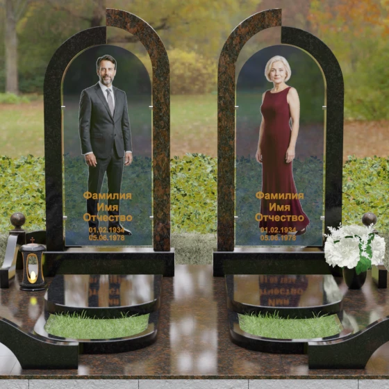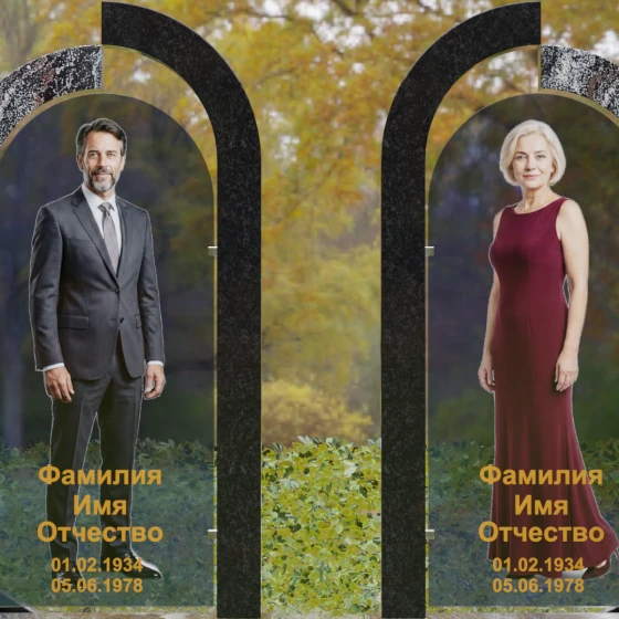 В основе композиции лежит классическая форма двойной арки, которая издревле символизирует небесный свод и переход в вечность. Две симметричные вертикальные стелы, объединенные общим основанием, образуют гармоничный дуэт. Каждая деталь здесь продумана до миллиметра: грани камня подвергнуты многоступенчатой обработке, что позволило добиться безупречной плавности линий. Внутреннее пространство арок заполнено панелями из закаленного стекла, на которых методом высокоточной печати нанесены полноростовые портреты. Особое внимание стоит уделить художественному фону, нанесенному непосредственно на стеклянную основу: мягкие очертания осеннего леса создают атмосферу умиротворения, не отвлекая внимания от главных образов.