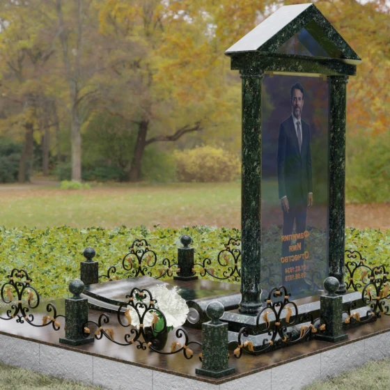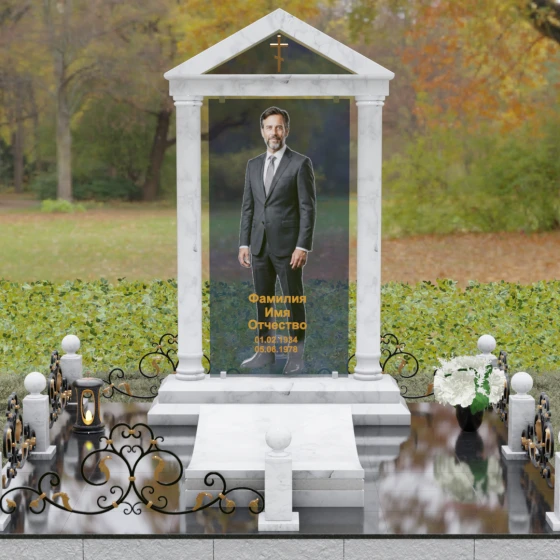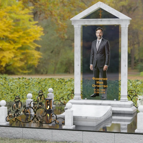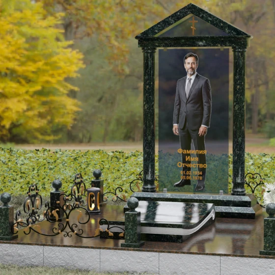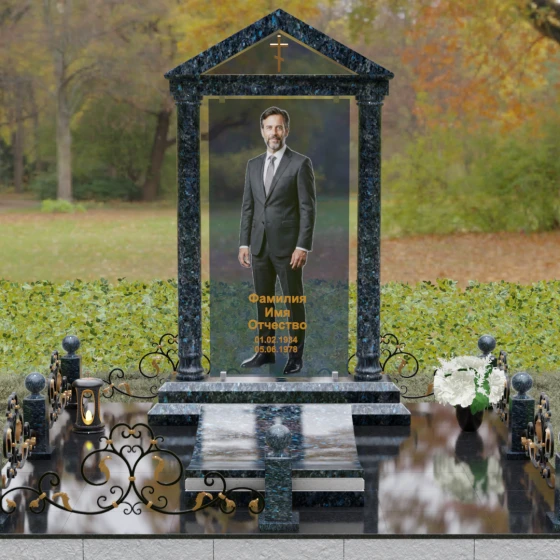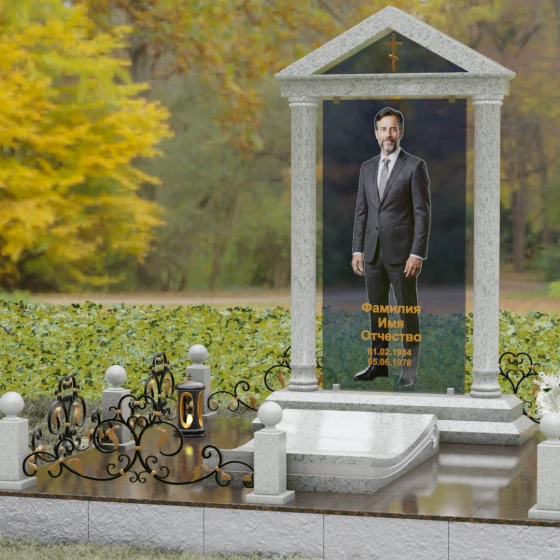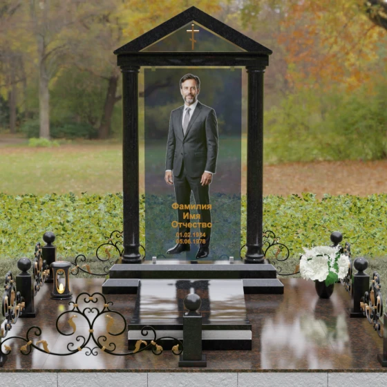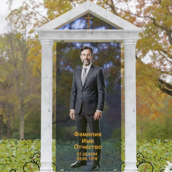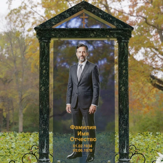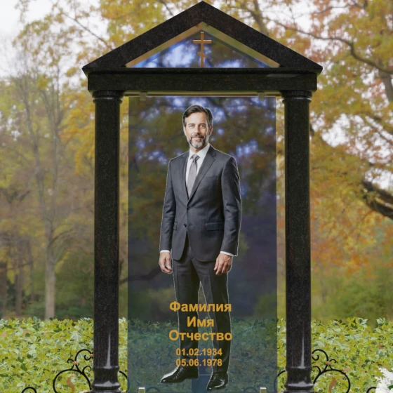 Особого внимания заслуживает центральный элемент — прозрачная панель из высокопрочного стекла, заключенная между колоннами. На нее нанесен полноростовой портрет и художественный фон в виде лесного пейзажа. Это технологичное решение создает эффект присутствия и глубины, который недоступен при обычной гравировке на камне. Пейзаж с изображением деревьев, нанесенный на внутреннюю часть композиции, символизирует единение души с природой и покой.