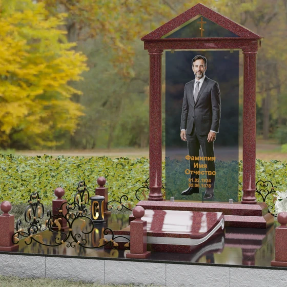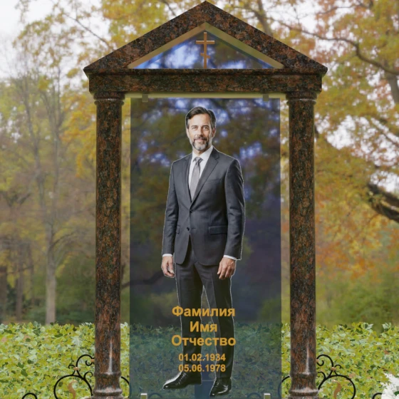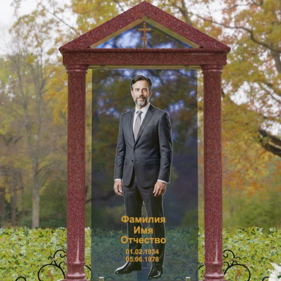 Данное ритуальное изделие представляет собой сложную архитектурную композицию, выполненную в величественном стиле античного портала или православной часовни. В центре художественного замысла лежит идея «окна в вечность»: два массивных гранитных столба с идеальной круговой полировкой поддерживают классический треугольный фронтон. Венчает эту строгую конструкцию лаконичный православный крест, чей силуэт четко выделяется на фоне неба. Использование колонн придает надгробию объем и монументальность, превращая место захоронения в сакральное пространство, защищенное каменными сводами.