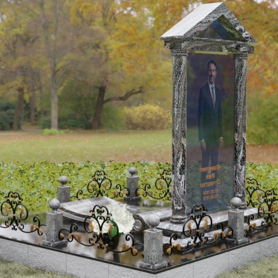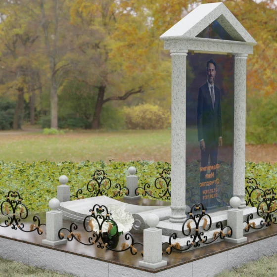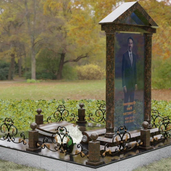 Комплексное благоустройство участка выполнено в едином ансамбле с центральным сооружением. Основание покоится на прочном гранитном цоколе, который надежно фиксирует всю конструкцию. Периметр обозначен низким каменным ограждением с массивными столбиками, каждый из которых увенчан идеально отполированным декоративным шаром. Шары — древний символ бесконечности и завершенности жизненного пути. Вставки из кованого металла в ограждении добавляют композиции легкости и ажурности, не нарушая общей строгости. Вместо открытого грунта используется сплошное мощение или закрытая надгробная плита, что обеспечивает безупречный вид участка на десятилетия и значительно упрощает уход за ним.